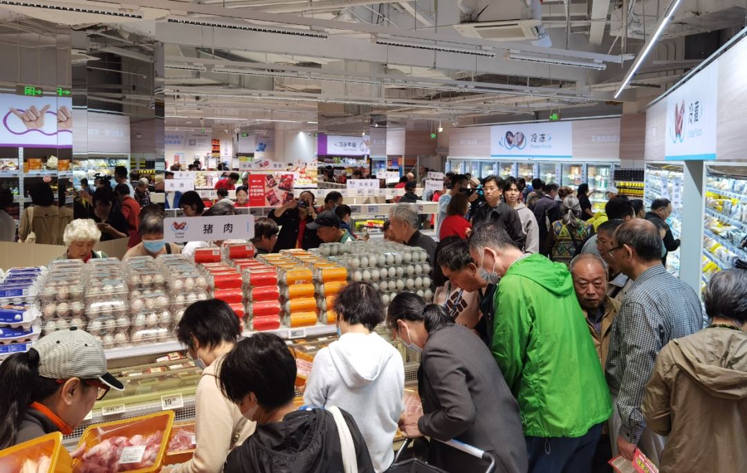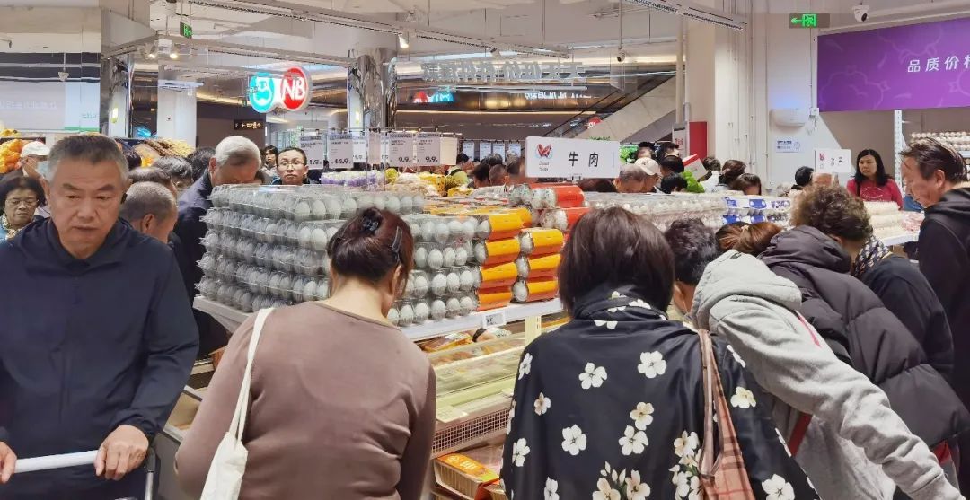 室外小雨霏霏,室内热火朝天。家住附近的阿姨爷叔们闻讯赶来,购物车里塞得满满当当。“我是我们小区里的人通知我的,他们已经买好了,买了蛮多东西的。”“买点鸡蛋,买点大公鸡肥皂液,还要再买点牛肉。这家盒马离我们曹家渡近呀,总归挑近的买咯。听说有折扣,今天赶快过来,下雨天也要来。”