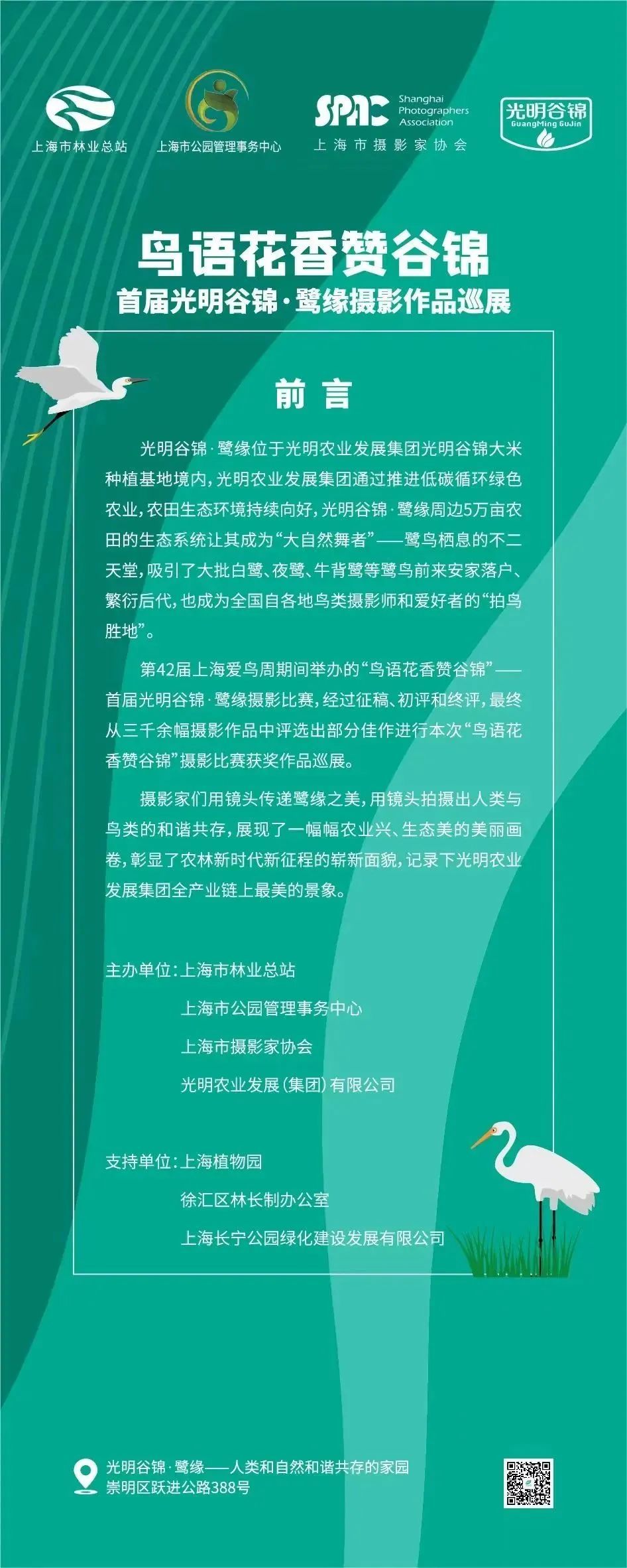 为迎接2023上海市保护野生动物宣传月的到来,由上海市林业总站、上海市公园管理事务中心、上海市摄影家协会和光明农业发展(集团)有限公司联合主办的首届“光明谷锦·鹭缘”摄影巡展于今日开展。