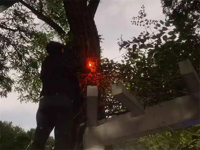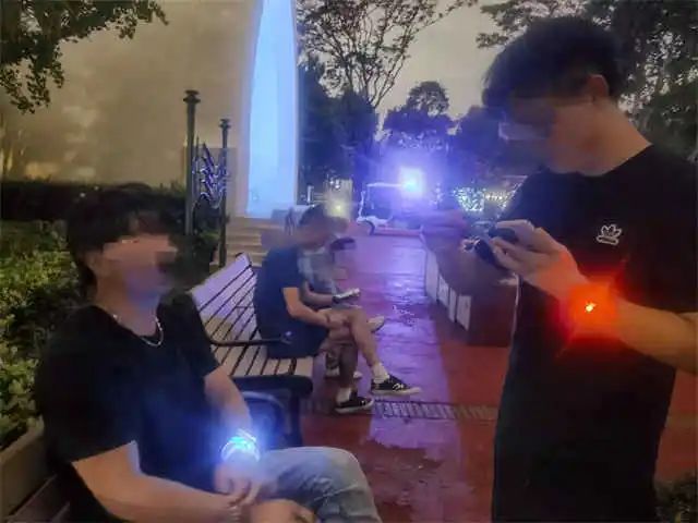 有趣的是,当天在公园里同时还有另外一支队伍在开展躲猫猫游戏。在车库附近,一声尖叫声“啊!”,一名扮作猫的女生一个箭步窜出来,眼明手快地抓住了一只老鼠,成功获得了荧光棒。