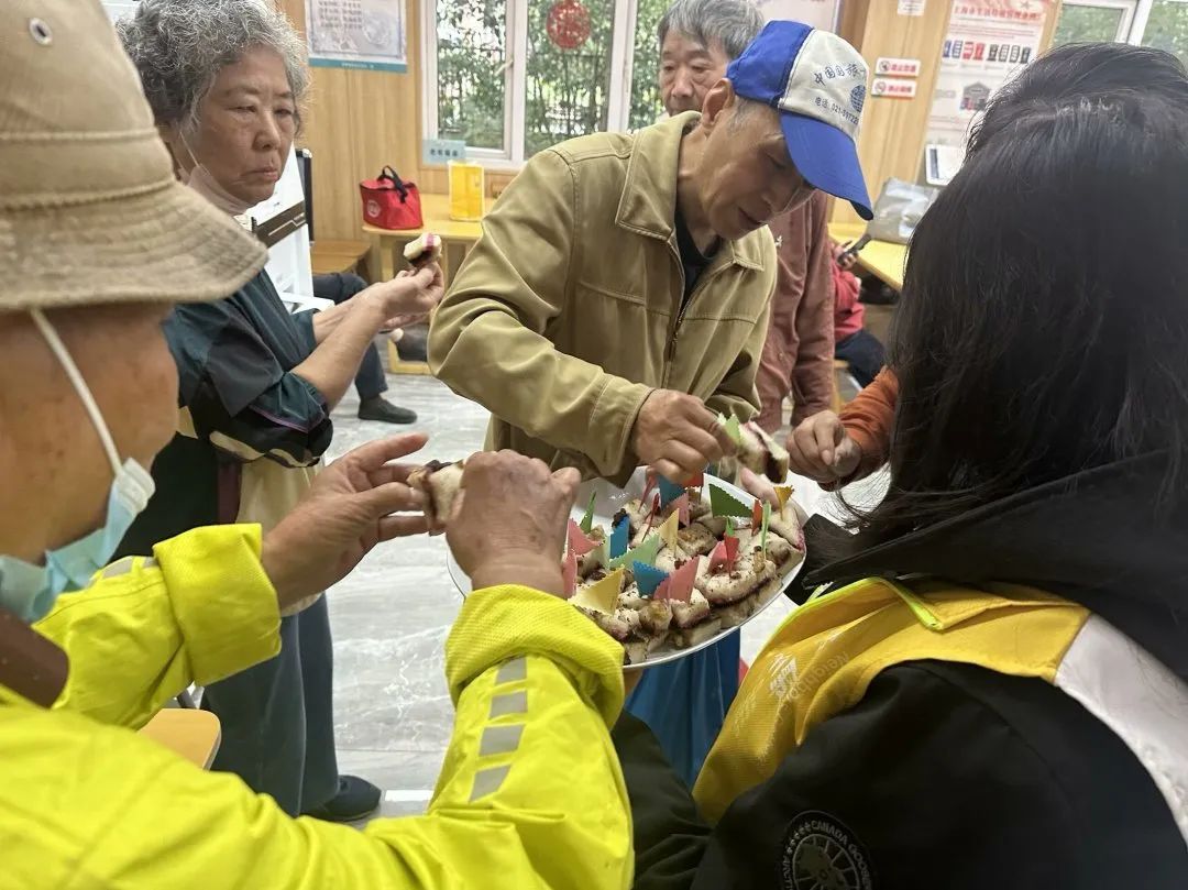 重阳糕制作完成后,大家还呼朋唤友,邀请片区里的居民共同品尝这亲手做的美味,将重阳糕送到理发屋、社区食堂,让大家共同感受到来自这个大家庭的重阳祝福和温暖。