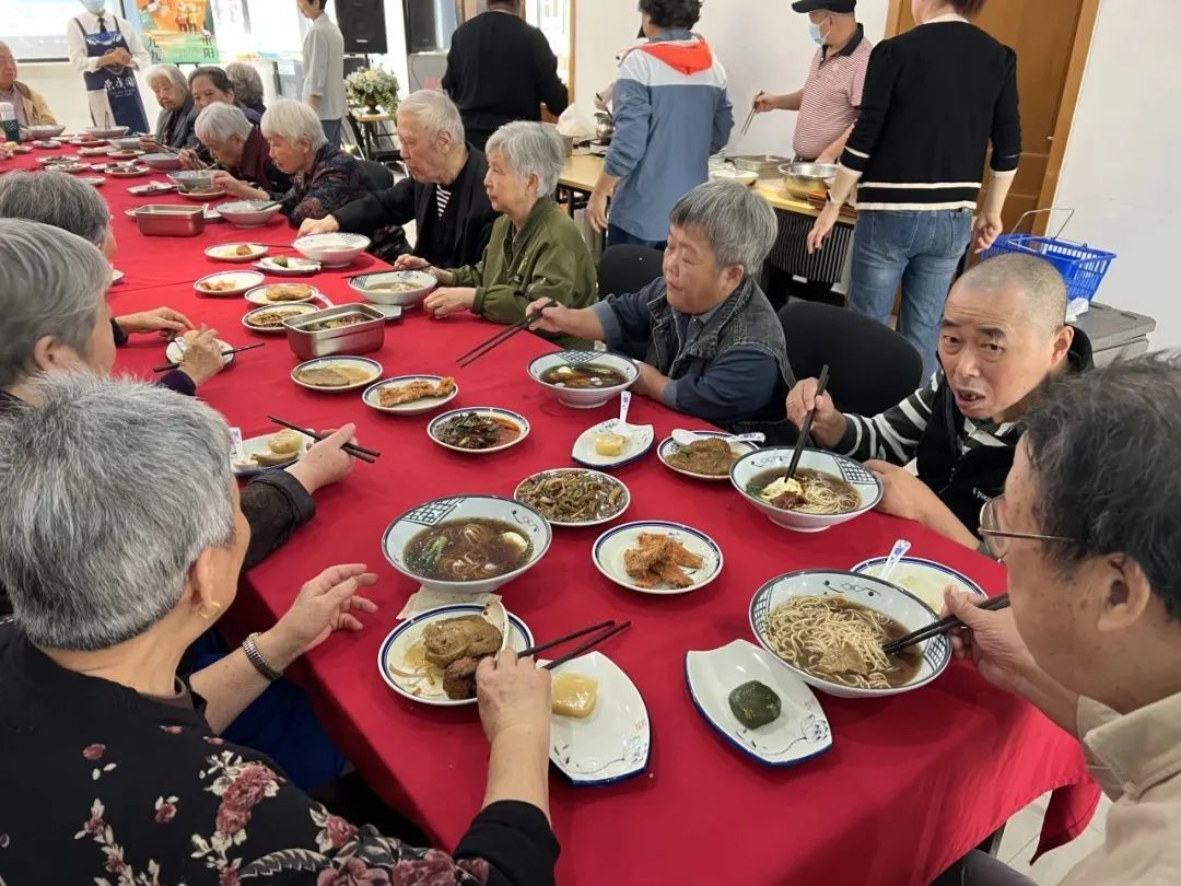 同一时间,就在相距一个路口的市光路第二居民区活动室内,一顿欢乐的长寿面大餐也拉开了序幕。面馆工作人员们将煮面工具与食材运送到现场,为老人们现煮现吃。冒着热气的阳春面、新鲜出炉的小碗浇头,让大家乐不停。