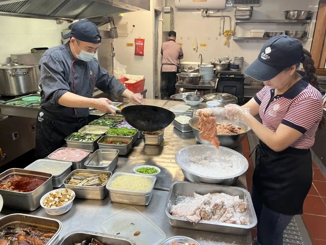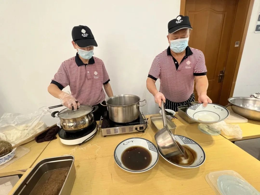 店长冉志辉也在其中忙活着。他说,为了中午这一顿面,他们提前多天就开始策划,专门罗列出适宜上海老年人口味的菜品。“今天除了主打的长寿面,我们准备的所有浇头都是店里销量高的几款,比如红烧狮子头、酱爆猪肝、冬笋肉片,还准备了小份重阳糕,做得尽可能软一点,方便老人消化。”