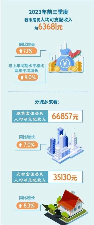 前三季度,上海市经济持续恢复,总体回升向好,民生保障工作继续加强,城乡居民收入和消费保持增长。受上年基数较低影响,前三季度,上海市居民人均可支配收入63681元,同比增长7.1%,两年平均增长4.0%。城镇常住居民人均可支配收入66857元,同比增长7.0%;农村常住居民人均可支配收入35130元,同比增长8.3%,农村居民收入增速继续快于城镇居民。