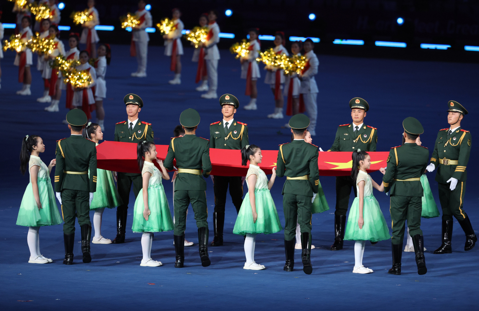 交汇点讯 10月22日晚,以“心相约,梦闪耀”为主题口号的杭州第4届亚残运会开幕。开幕式上,江苏男子轮椅击剑运动员孙刚和广东女子轮椅篮球运动员黄晓连担任中国体育代表团旗手。