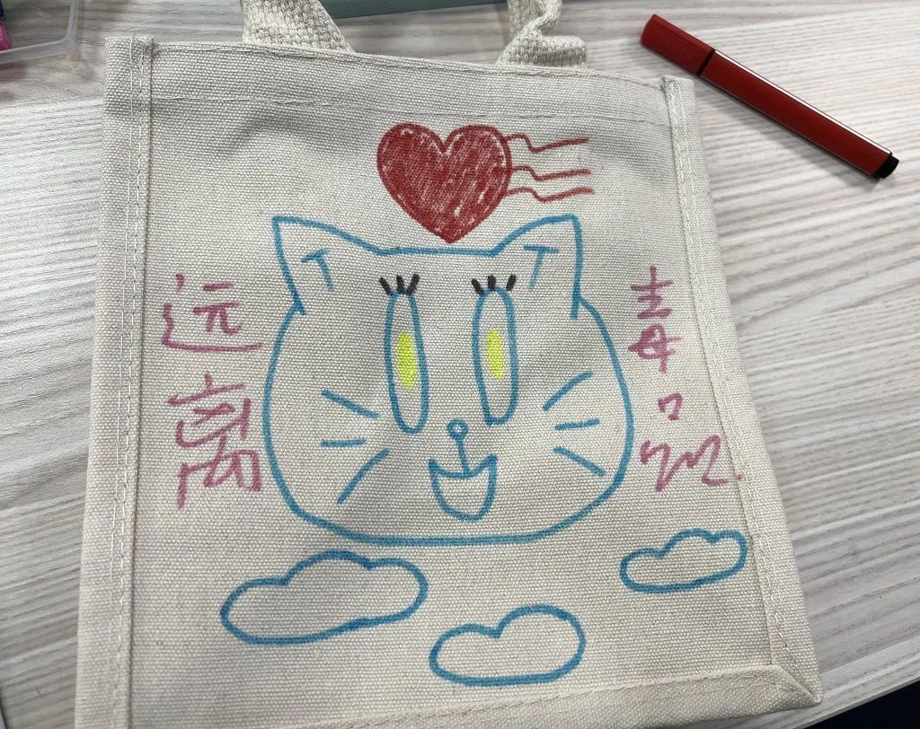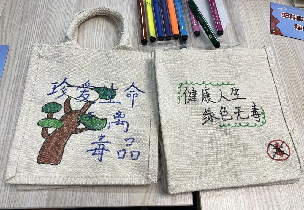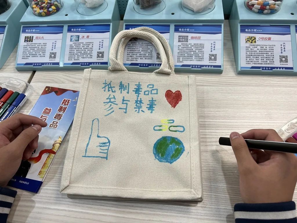 接着,禁毒社工重点介绍校园禁毒志愿者的光荣职责和任务,向学生们提出志愿服务的具体要求,教诲学生们从自身做起、坚决抵制毒品、共同参与禁毒斗争,争做合格禁毒志愿者。最后,禁毒社工给每位志愿者发放一个帆布袋,引导他们用手中的彩笔画出心声、写下感受。