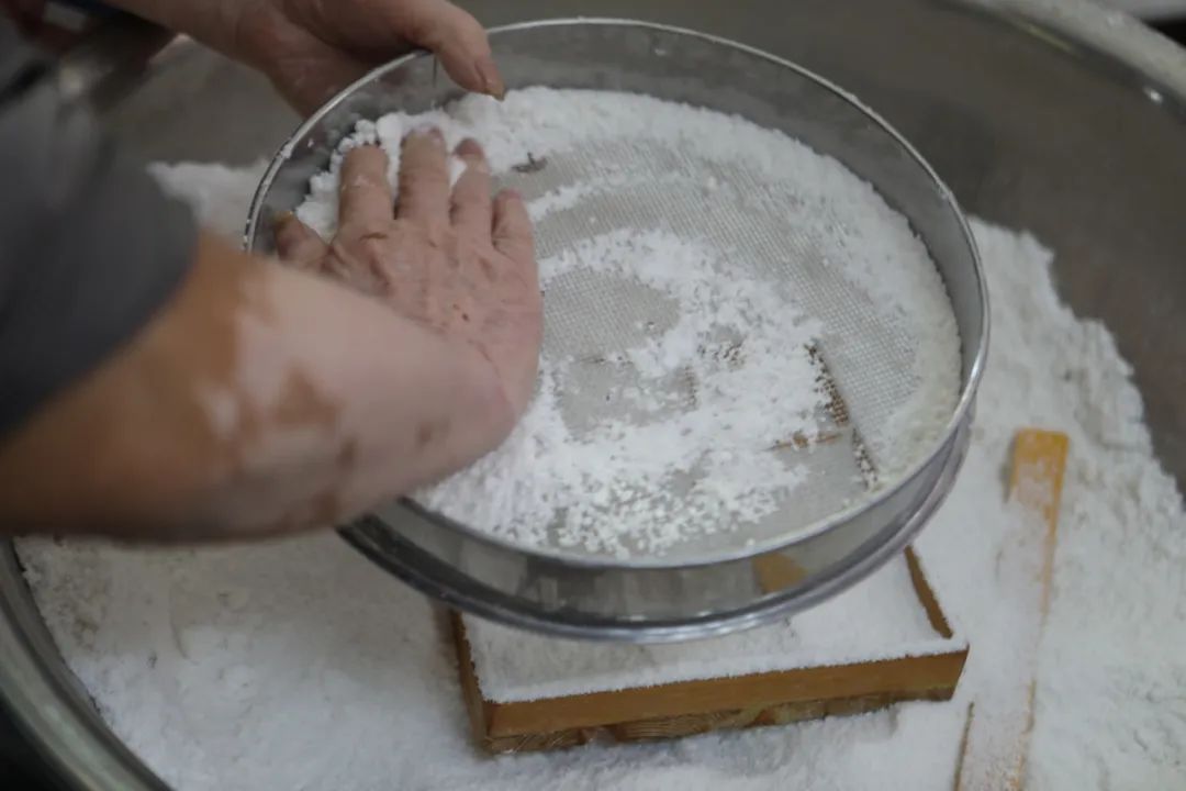 糯米粉经过筛网进入蒸格