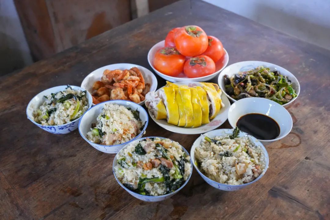 吃着新米做的咸肉菜饭
