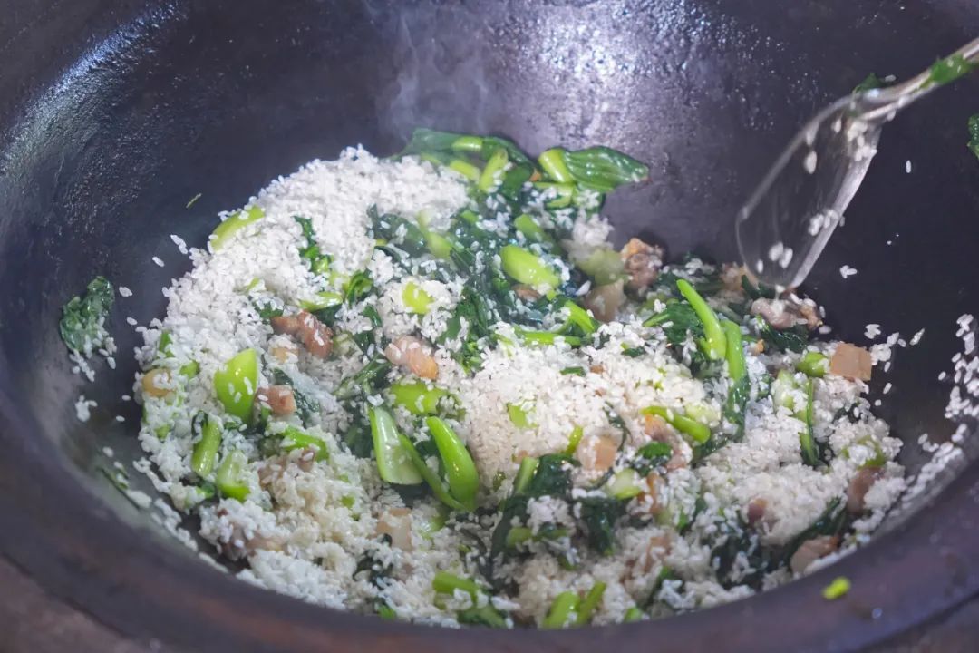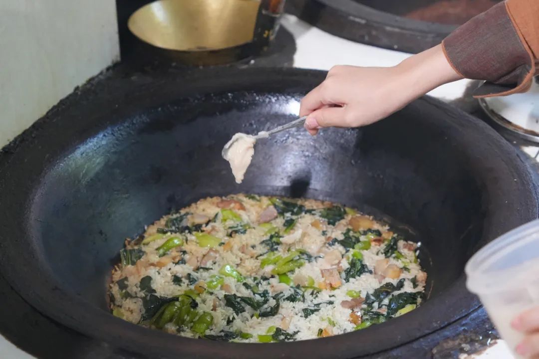 最后掀开锅盖,用勺子拌匀即可,如果不够咸的话,可以再适当加一些盐。这时候加猪油拌进去,味道会更香。
