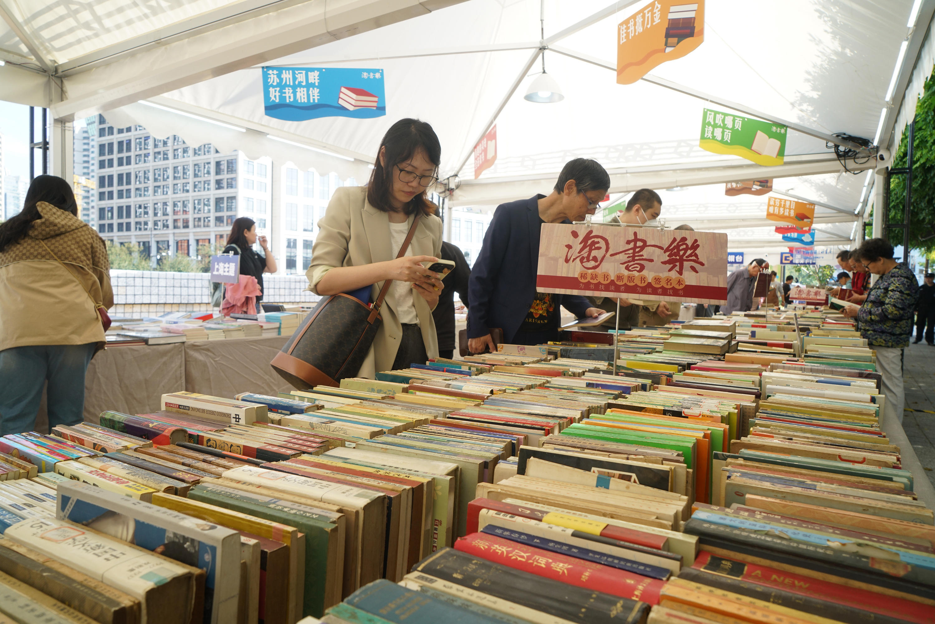 记者发现,现场新增的“旧书收购摊位”格外引人关注。据悉,9月“淘书乐·樱花谷旧书市集”期间,上海图书公司就将古旧书收购业务带到了苏州河畔,“‘淘书乐’不仅售书,也收书”这一个性化服务受到了读者们的肯定与欢迎。因此,这次的“旧书收购摊位”,特别为读者提供专业、便利的旧书收购咨询服务,读者既可将家中积攒的旧书带到现场,也可在此处预约上门收购,让书籍在爱书人的手中真正流通起来,延续“淘书乐”品牌“为书找读者、为读者找书”的理念。