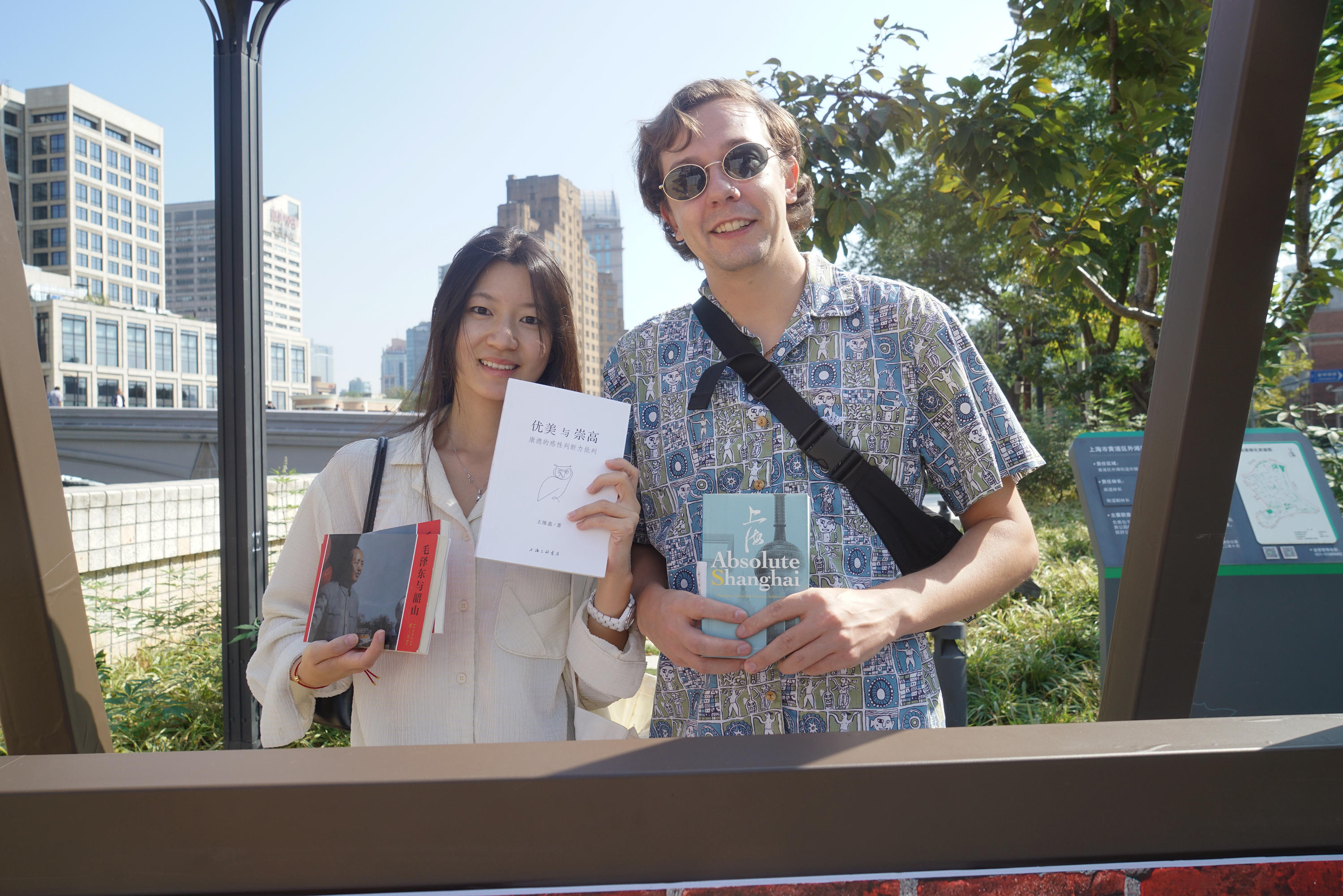 车小姐是今天市集的第一位购书者。“原本我是带着美国来的朋友逛逛苏州河的,走到樱花谷这里发现有个旧书市集感觉很有意思。”她的朋友Patrik对中国感兴趣,便买了两本连环画《毛泽东和韶山》。