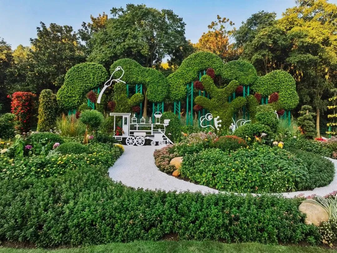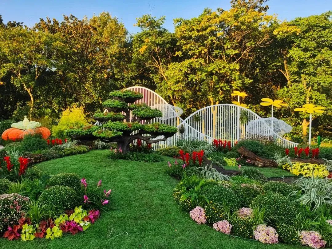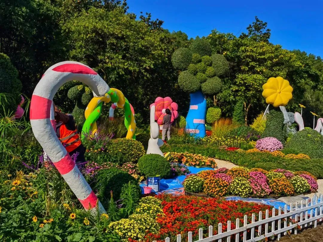 室外景点展区位于原花艺馆位置,将依托森林背景结合菊花展主题布置8组室外景点,以菊花为主要造型材料,采用绿雕、花境等形式,打造丰富多样的菊花景观,充分展现人民城市建设发展取得的丰硕成果和日新月异的城市变迁。