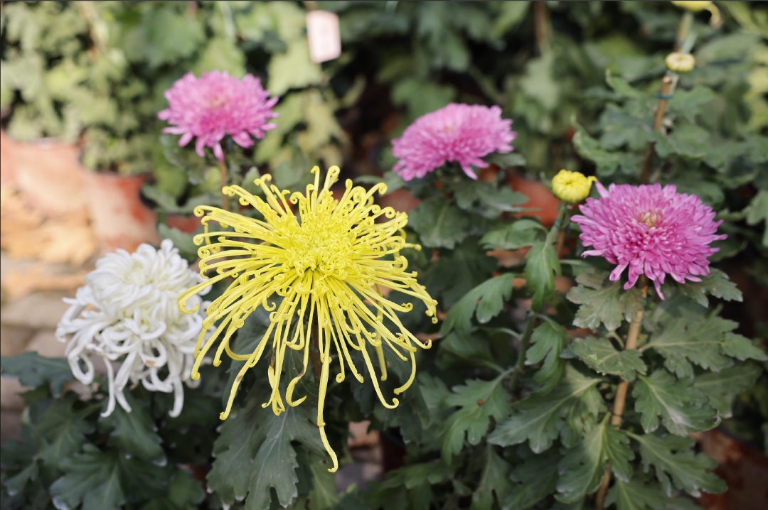 展示区位于香樟广场区域,采用精品菊花造景与科普文化相融合的布置方式,集中展示了菊花品种与菊花文化的独特魅力。精品菊花共展示约500个品种,主要为来自全国各地的传统独本菊、多头菊、案头菊、切花菊以及国外进口新奇特小菊等。