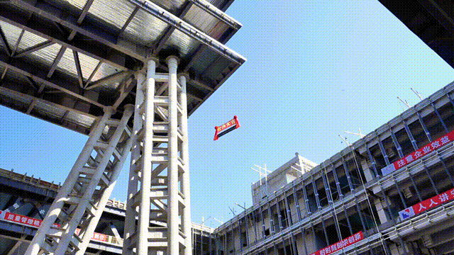 从一纸蓝图到轮廓初显,经历了约400个日夜,10月24日,由高度约35米的二根组合巨型柱支撑的顶部26米的悬挑结构金环·金钥完成了最后一根钢梁的吊装、焊接,实现主体结构封顶。