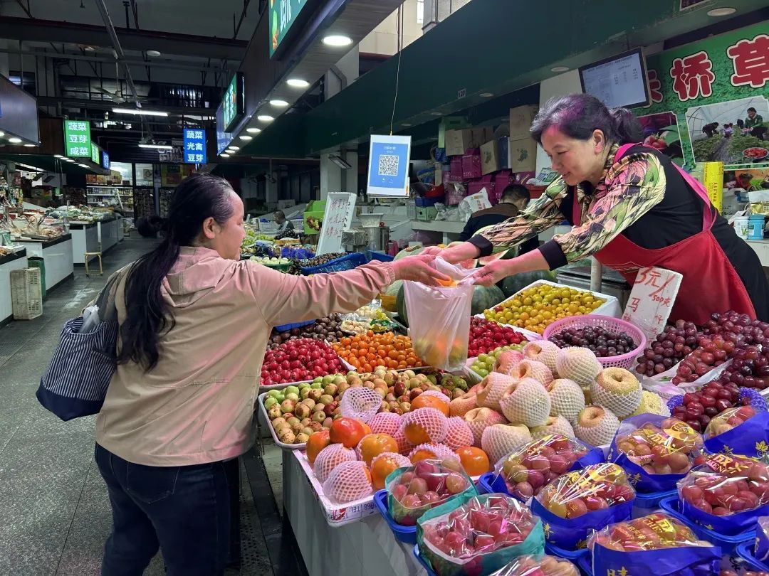 在裕民集贸市场,色彩缤纷的各类水果摆满水果摊,吸引不少市民前来选购。