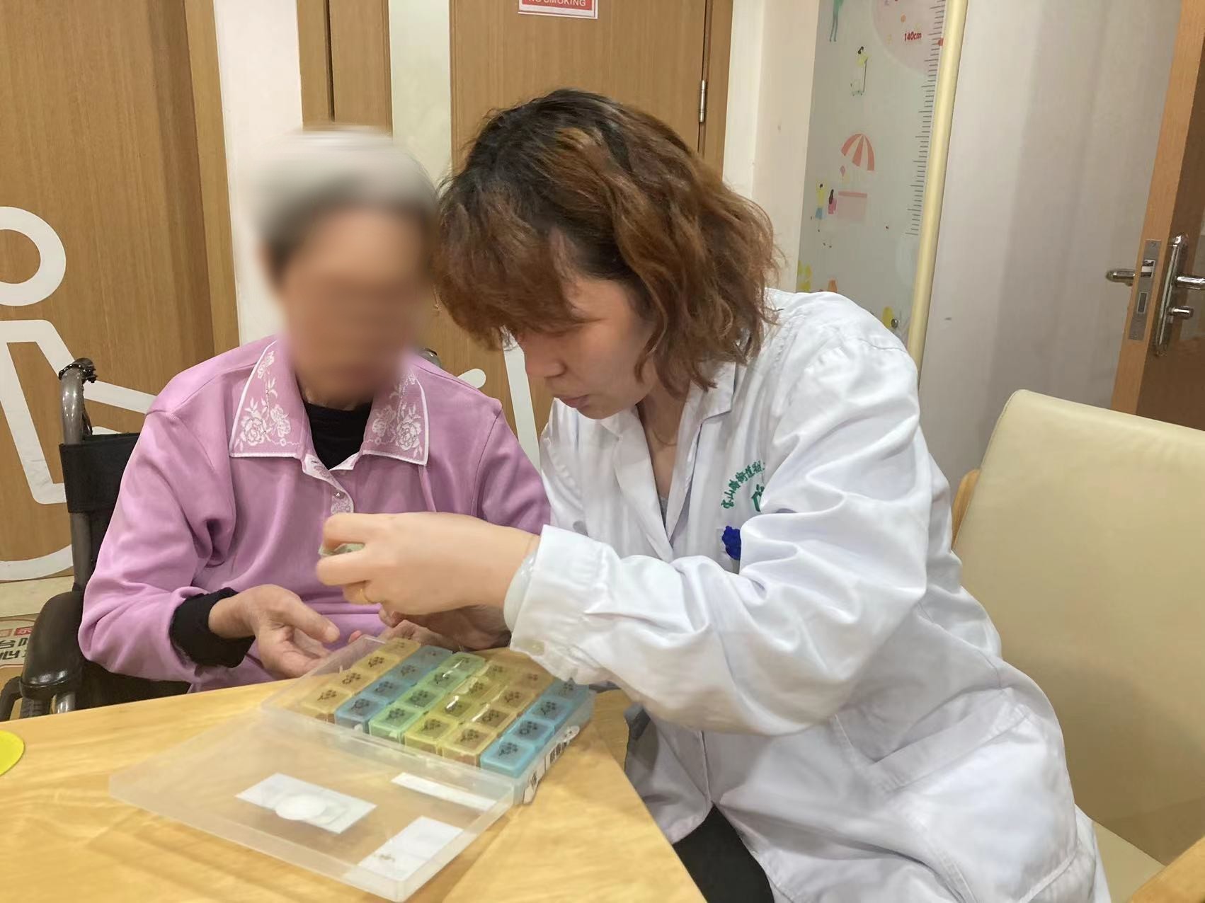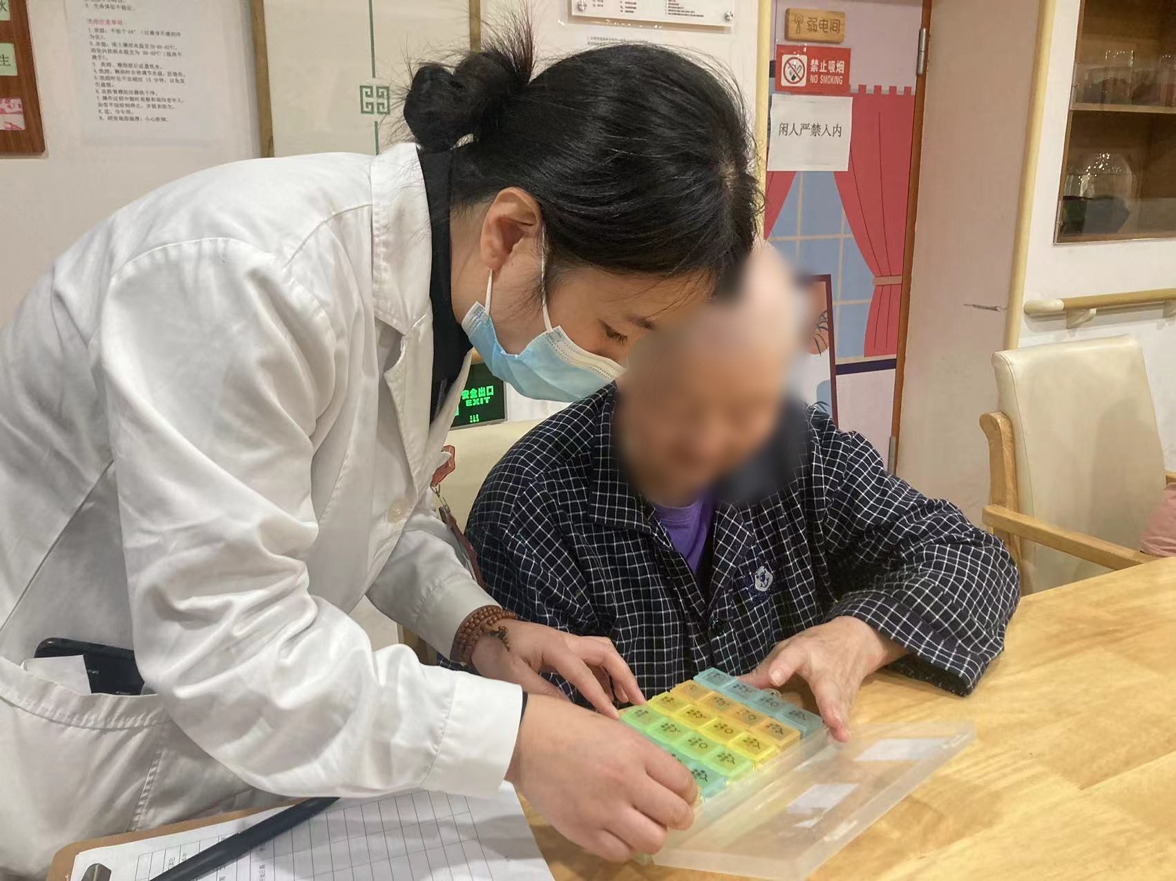 居住在静安区宝山路社区长者照护之家、今年85岁的蔡阿婆,患有失眠、便秘、高血压等慢性疾病,每日需服用5、6种药,用药安全成为老人最为关心的问题,然而由于腿脚不便,蔡阿婆无法经常外出寻医问诊。