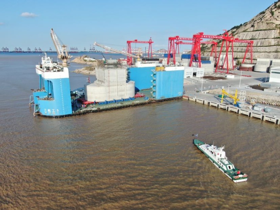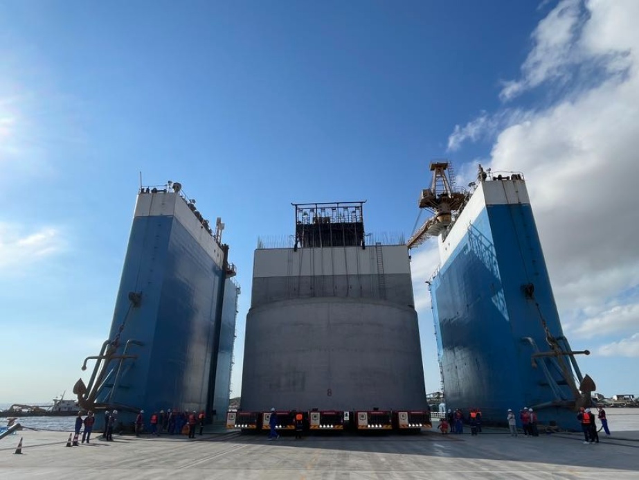 首个出运的“大圆桶”长36.6米,宽20米,高20米,自重高达3800吨,需要通过半潜驳运输至洋山港小洋山北作业区施工现场。据悉,整个小洋山北作业区建设第一阶段共需要26个“大圆桶”,后续总需求将超过500个。本次从大洋山海工基地运输至施工现场,从装卸到运输,整个过程从3天可缩短至8个小时以内,提高了小洋山北作业区建设效率。