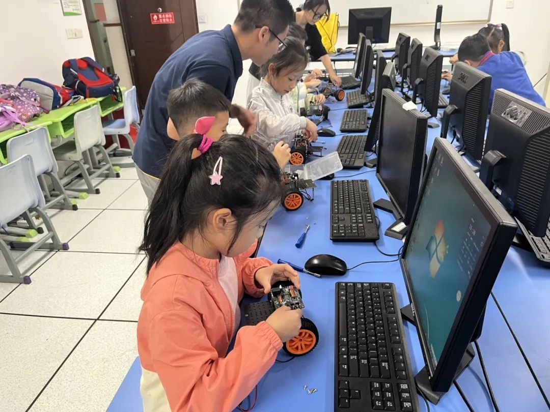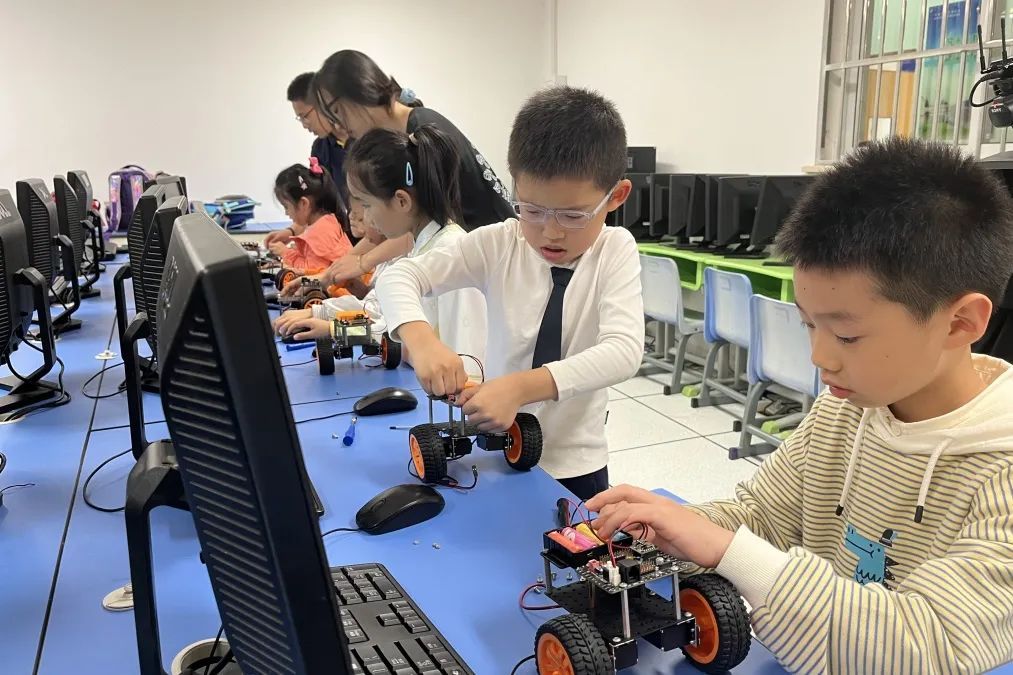 下午四点半,在五角场小学的电脑房里,孩子们在电脑上设计的编程,正在让机器人“动”起来。大家聚在一起,观察机器人行走路线的准确性、速度和用时......“在老师的帮助下,我搭建出了更为复杂的操作指令,机器人在电脑程序的指令下也有了更精细的实践动作。”在编程老师的指导下,孩子们被生动有趣的创意编程项目深深吸引,运用多元的素材,结合自己的想法,创造出能“听话”的机器人。