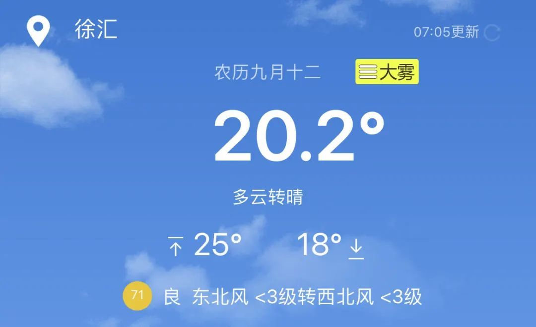 今天(10月26日)天气跟昨天相当,天晴风小,受辐射降温影响,上午以前本市大部能见度低,昨晚21时10分上海中心气象台发布大雾黄色预警,昨夜今晨崇明、奉贤、浦东、金山陆续更新为大雾橙色预警信号,部分地区能见度一度不足100米,晨间有出行安排的小伙伴一定要注意道路交通安全。