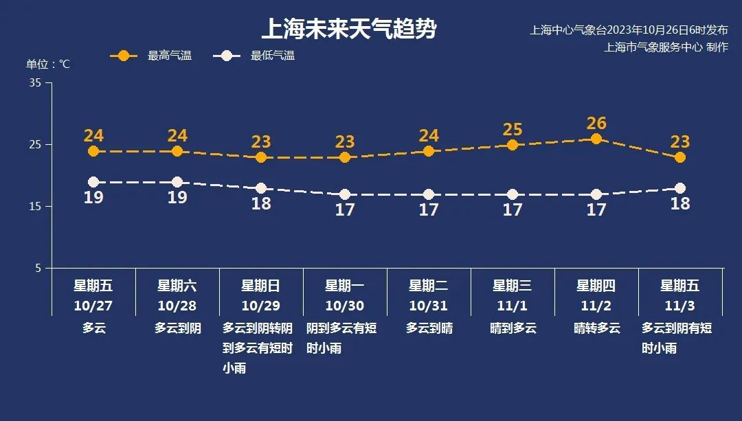 但由于这股冷空气南下较浅,对上海影响也比较有限,预计本周五至双休日会有2~3℃的降温,周日至下周初还会有一次云系增多伴弱降水的天气过程,但这都是小插曲,秋高气爽的主旋律暂时还没有变。