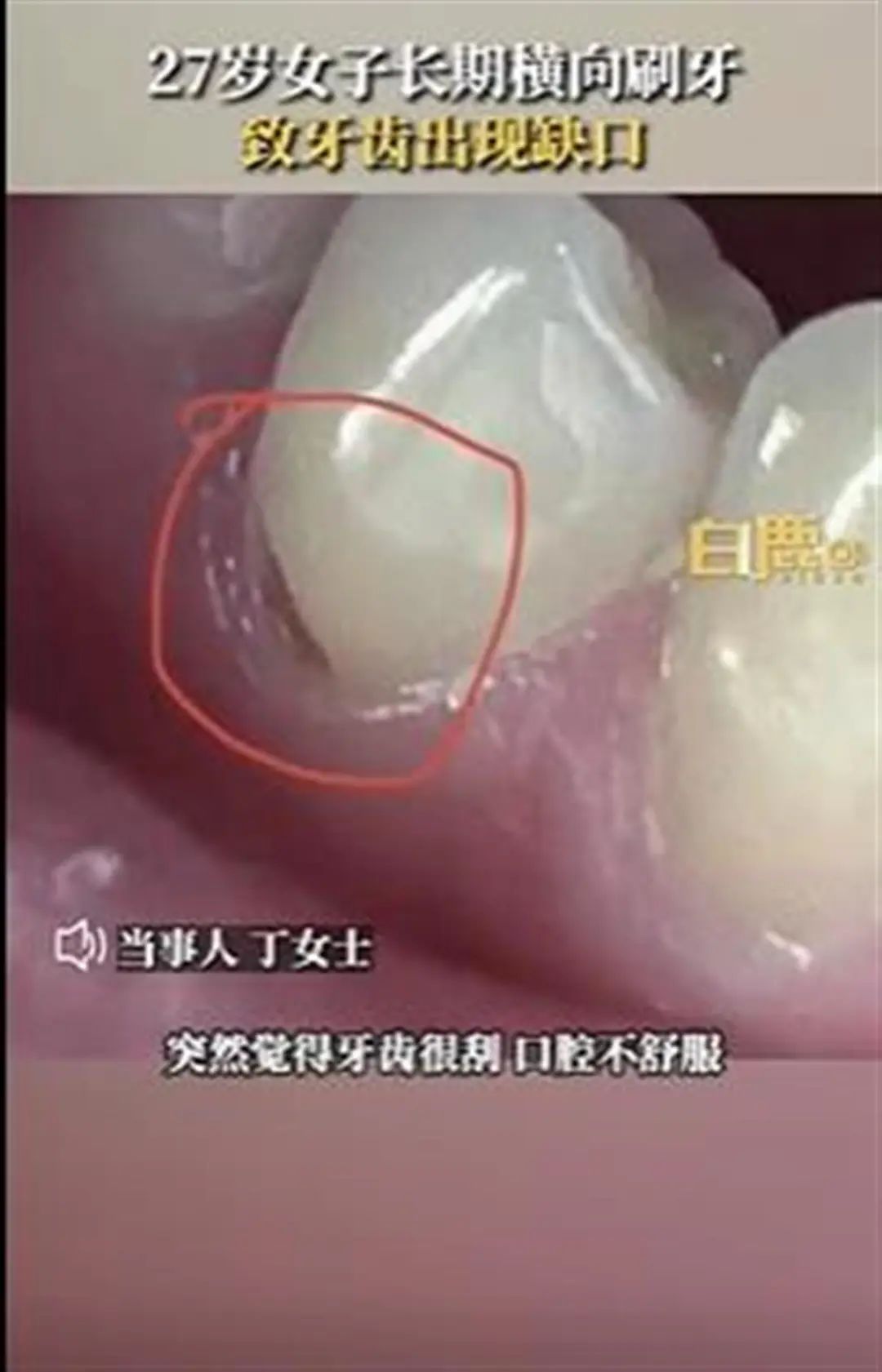 近日,据媒体报道,广东佛山一名27岁的丁姓女士因长期横向刷牙导致牙齿出现缺口。丁女士表示,自己在刷牙时一直采用横向刷牙的方式,上周口腔不舒服时发现牙齿出现了一个小的缺口。