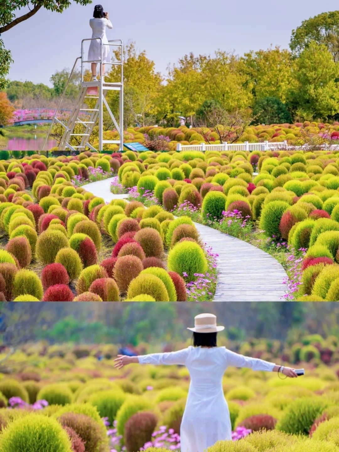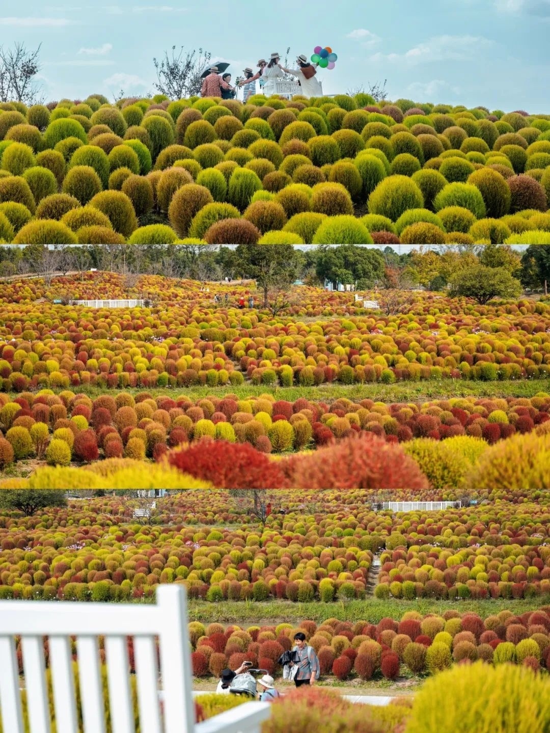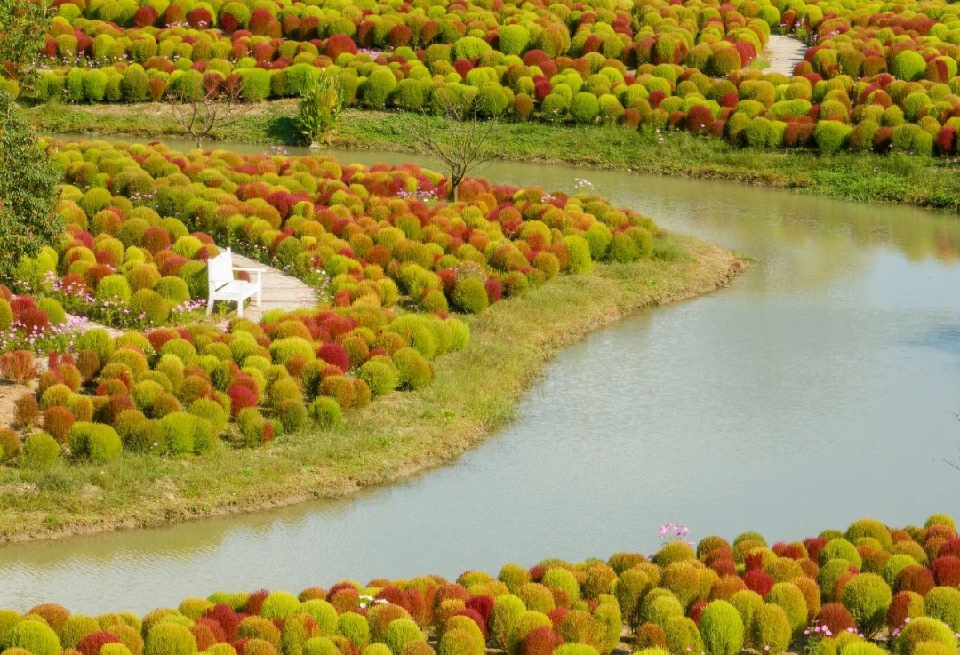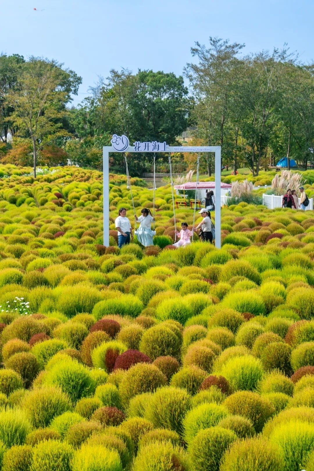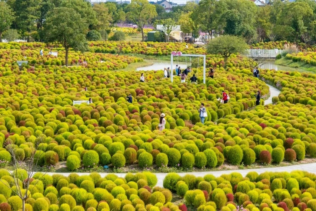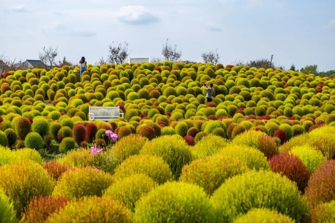 在花开海上生态园的芳香花园,一大片青红交接的“毛毛球”,分布在高地起伏的地面上。60万株地肤汇聚在一起,仿佛是一大块毛茸茸的地毯覆盖着芳香花园。嫩绿、青绿、橘红、棕红等奇妙的颜色多变而丰富,游客在地肤丛中穿梭,打卡拍照。