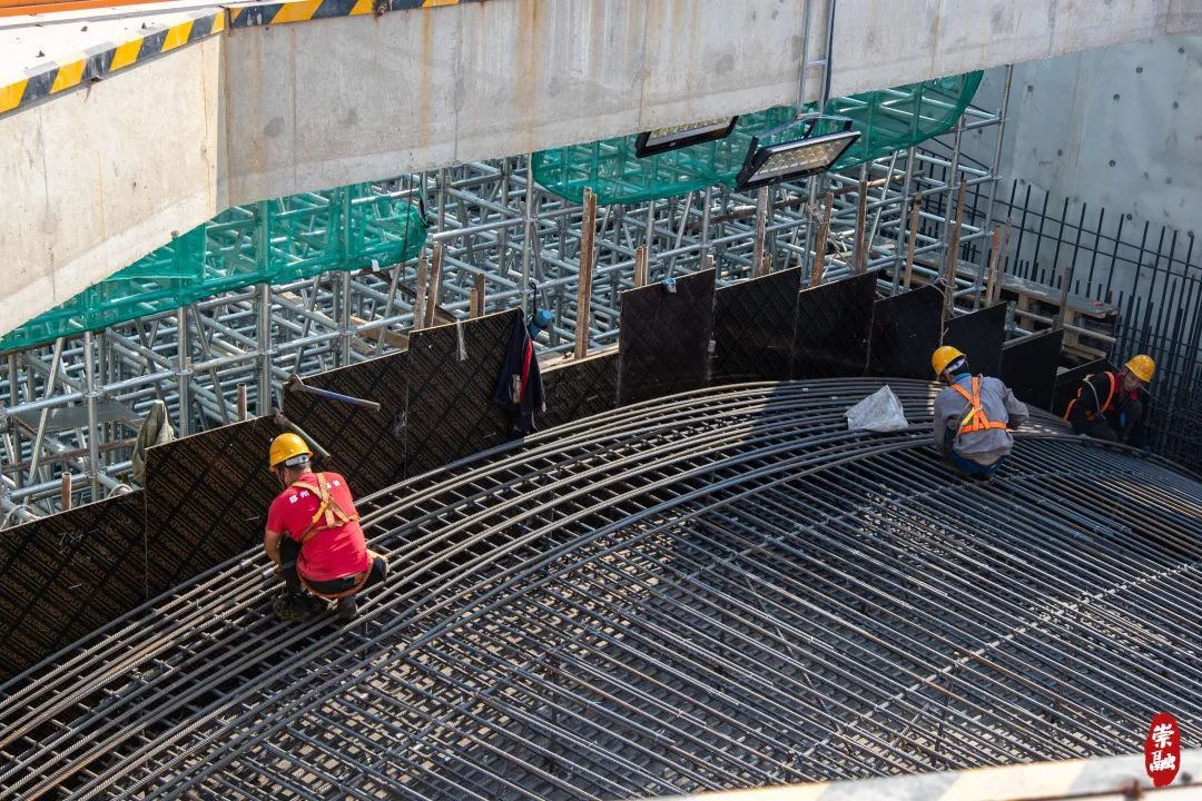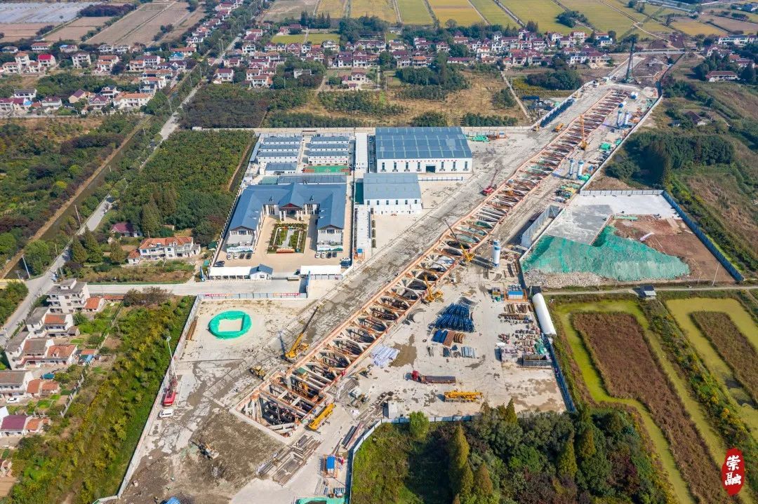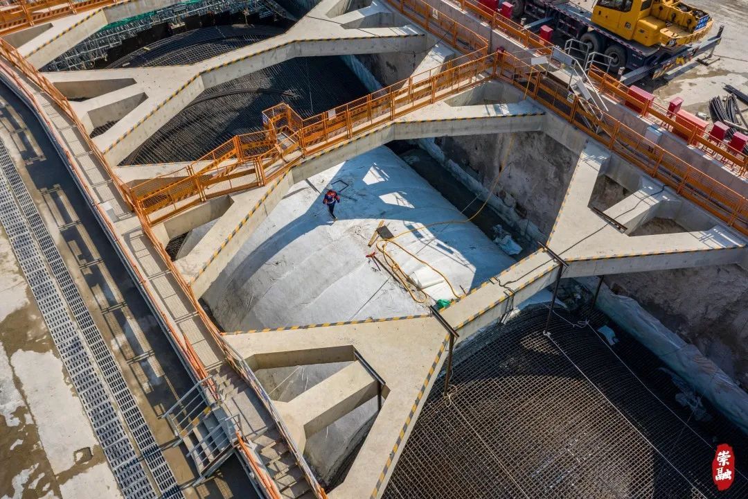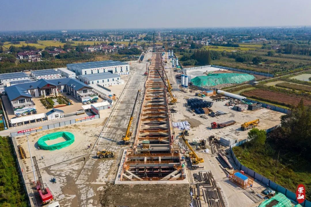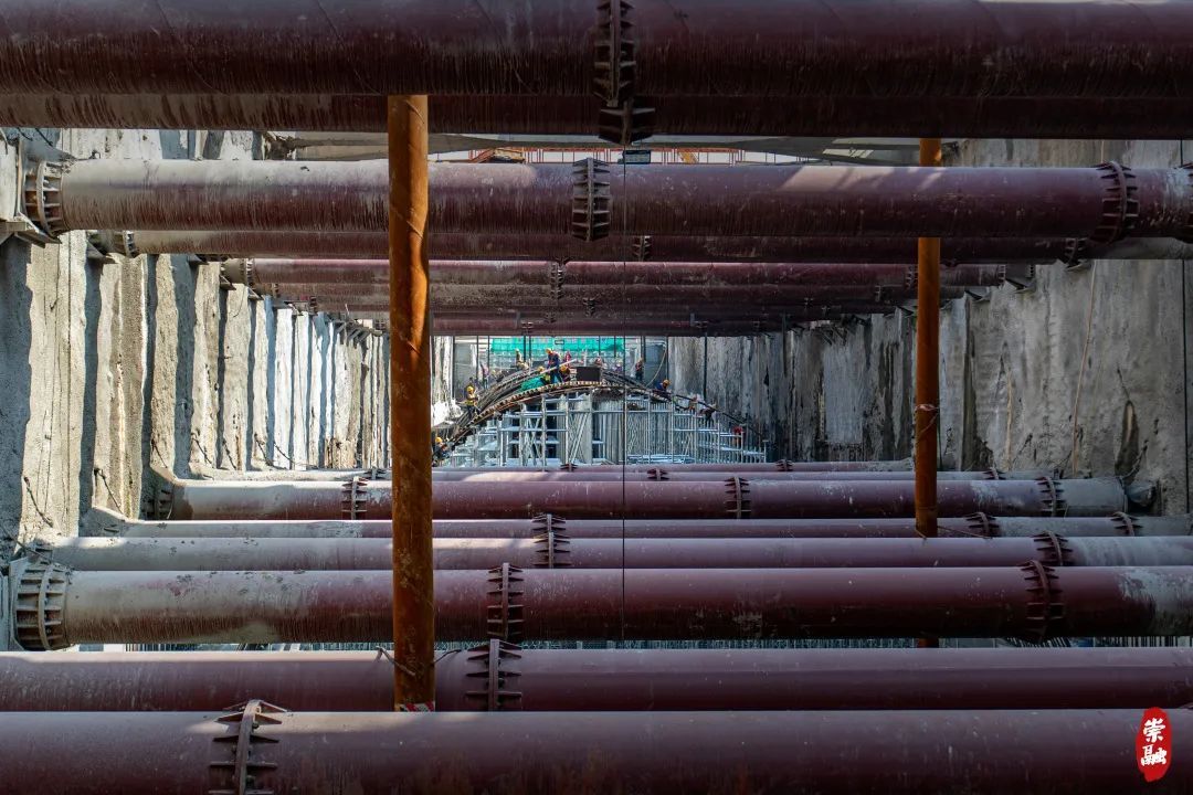 与三号井相连的明挖基坑是从地面向地下开挖的槽,未来,这里也是放置盾构机“尾巴”的场地。目前明挖段同样施工进展迅速,首组拱形顶板(即隧道顶部)成功浇筑。因而,俯瞰之下,崇太长江隧道的外观已经初露雏形。