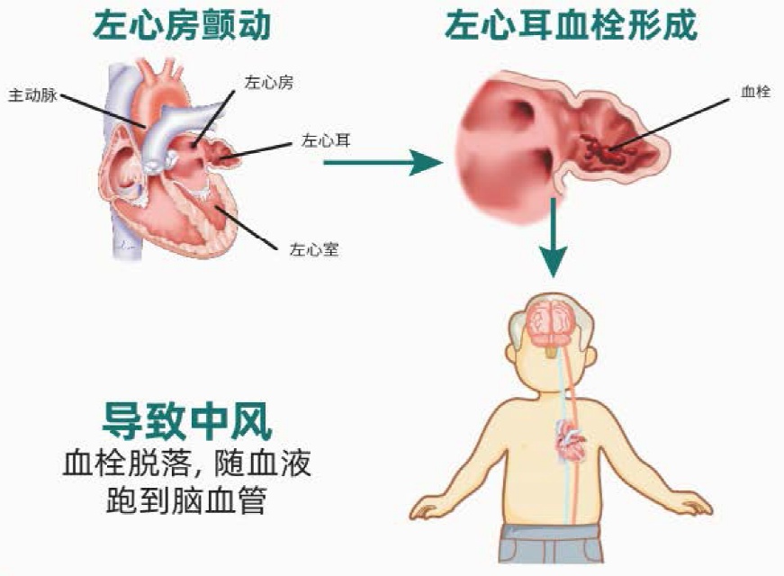 在房颤患者中,心房不规律的收缩可能导致血液在其中滞留并形成血栓,尤其是在左心耳这一小袋状结构中。如果血栓从左心耳脱落并流入血流,可能阻塞到大脑供血的动脉,从而引发中风。
