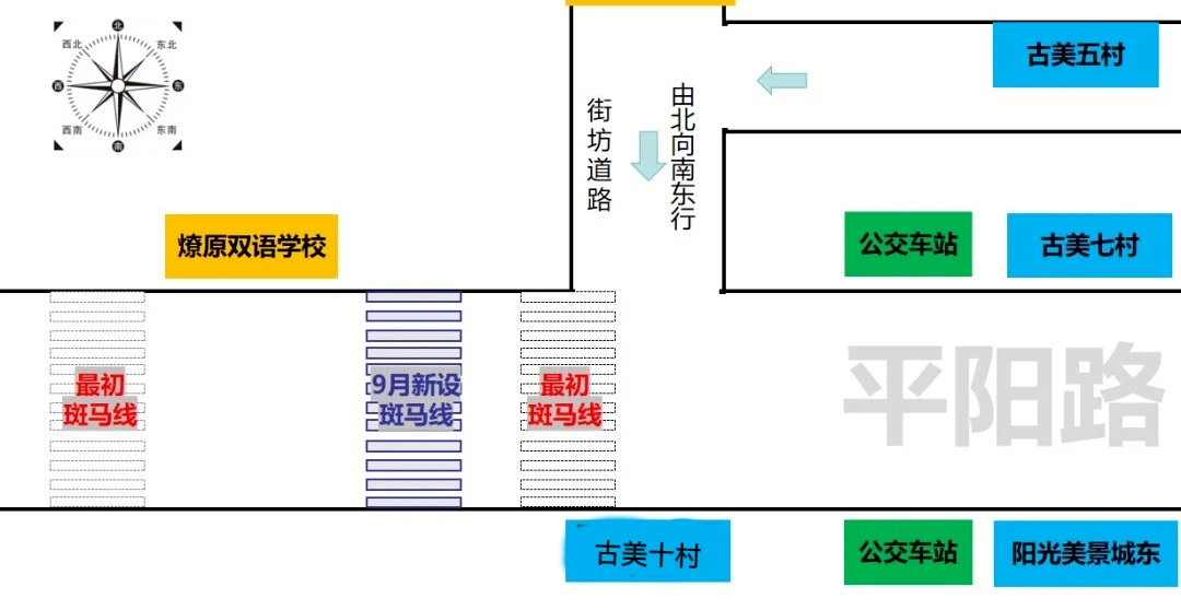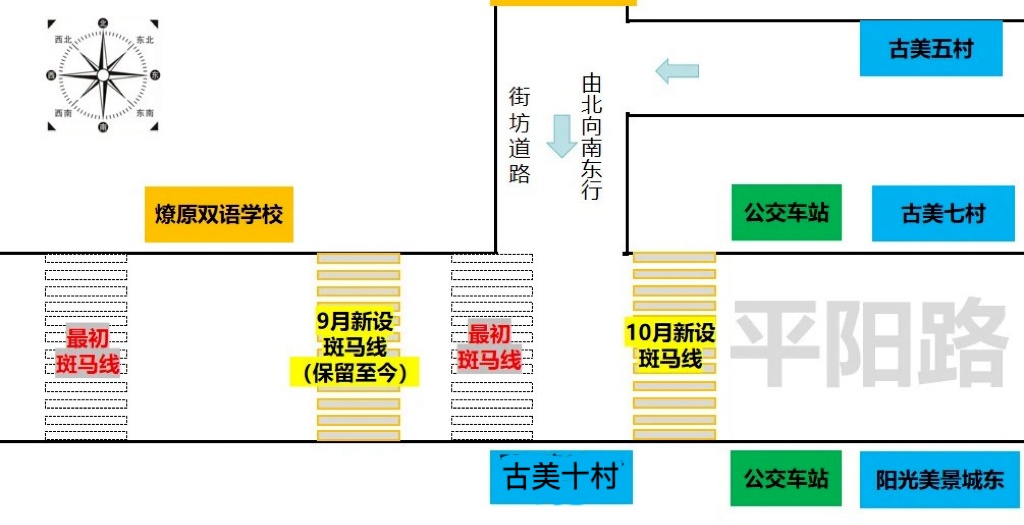 9月的一天,居民们突然发现,原本位于古美十村小区西侧的两条斑马线没了,取而代之的是,在原本两条斑马线折中的位置新划了一条斑马线。