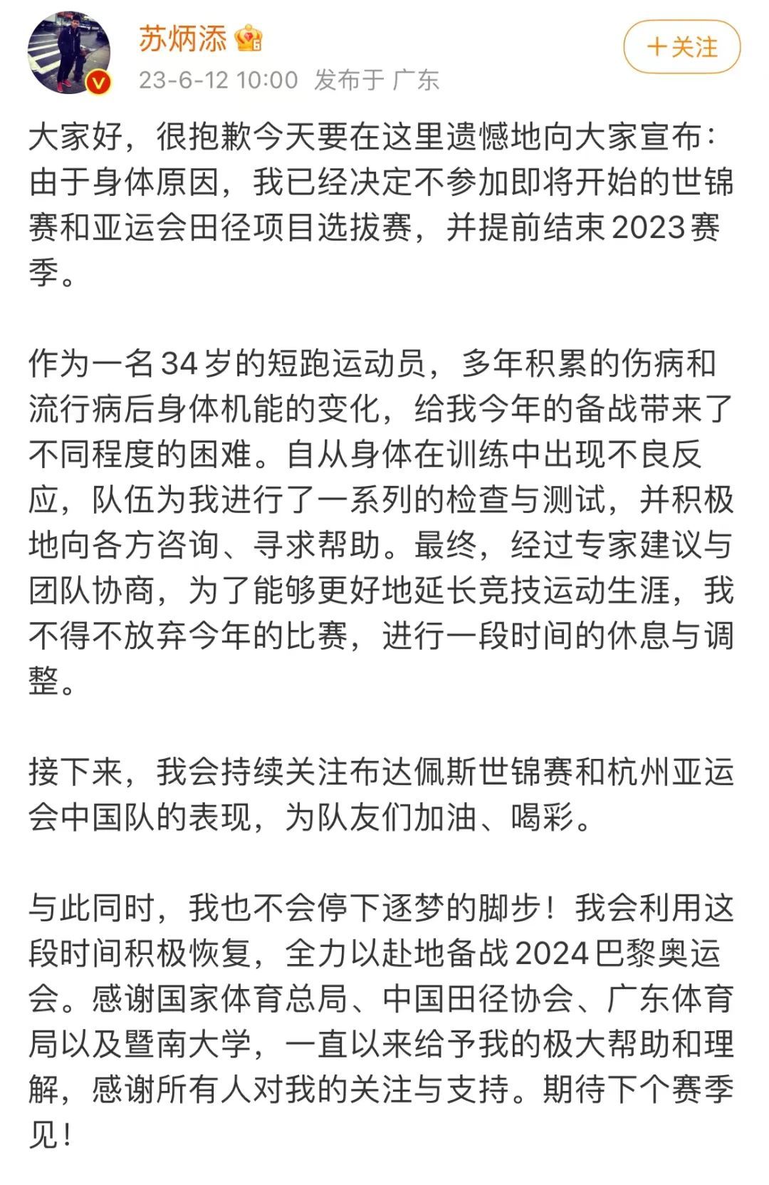 而在杭州亚运会期间,苏炳添在接受采访时表示,他此前提前结束赛季,是因为身体情况已经不容乐观,一些力量和体能训练都做不到了,甚至偶尔会有一些头晕的情况。在这样的情况下,苏炳添选择先放下比赛,调整身体状态。但他也表示,希望能继续代表中国田径队,在巴黎奥运会上为国争光。