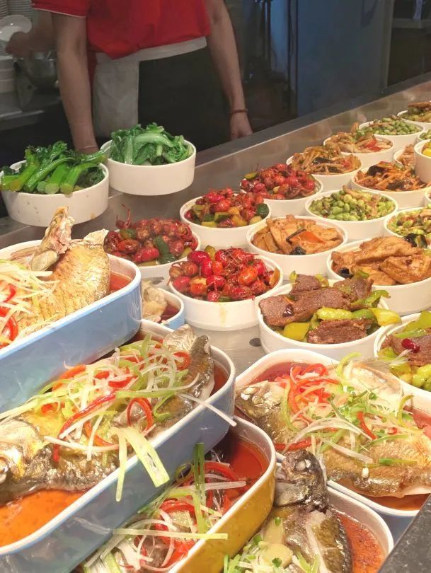 中餐的供应分为三个区域,分别是自选菜品区、花式套餐区,以及经典面条区。自选菜品区有各种菜肴20余款,菜肴融合各方口味、荤素合理搭配,供大家自行挑选。菜肴品种有本帮红烧肉、鱼香肉丝、农家小炒肉、炸猪排、八宝辣酱和各类炒饭炖品等等。花式套餐区会不定时推出一些特色套餐如广式烧腊套餐、老妈猪蹄套餐、毛血旺套餐和三鲜砂锅套餐等等。经典面条区以上海本帮面为主,搭配各种美味的面浇头,品种有鳝丝面、葱烤大牌面、熏鱼面、自制菜肉大馄饨和水饺等等。