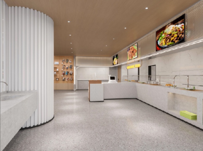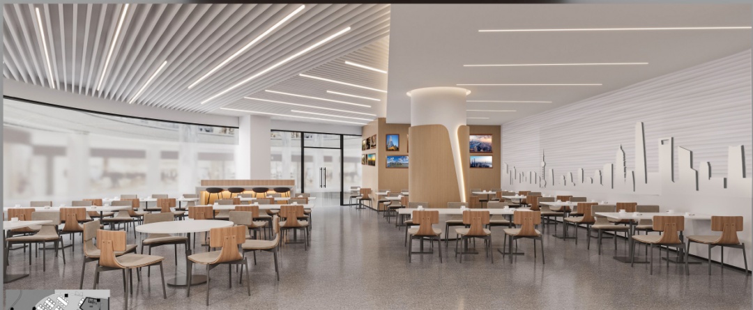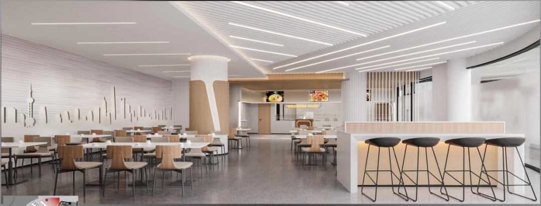 陆家嘴金融城白领餐厅,坐落于陆家嘴金融城党群服务中心(上海中心大厦和金茂大厦地下2层连廊交界处 花园石桥路155号B2层),城市现代风格搭配云雾下建筑群(上海中心、环球金融中心、金茂大厦、东方明珠)光的剪影,集美食、社交、公益宣传和艺术享受于一体。