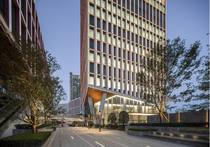 据介绍,两栋超甲办公楼分别高158米和108米,外立面采用“玻璃幕墙+暖色铝合金金属板”的格构设计,以别具一格的美学设计,延展了建筑格局,昭示高端商务形象。约3.2米标准层净层高、约14米净高挑高大堂,高区每三层中庭挑高的创新设计,为企业提供品质办公的体验。