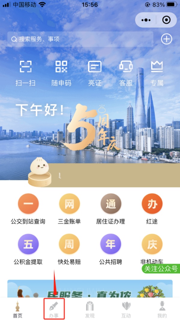 1.打开“随申办”,选择“办事”;