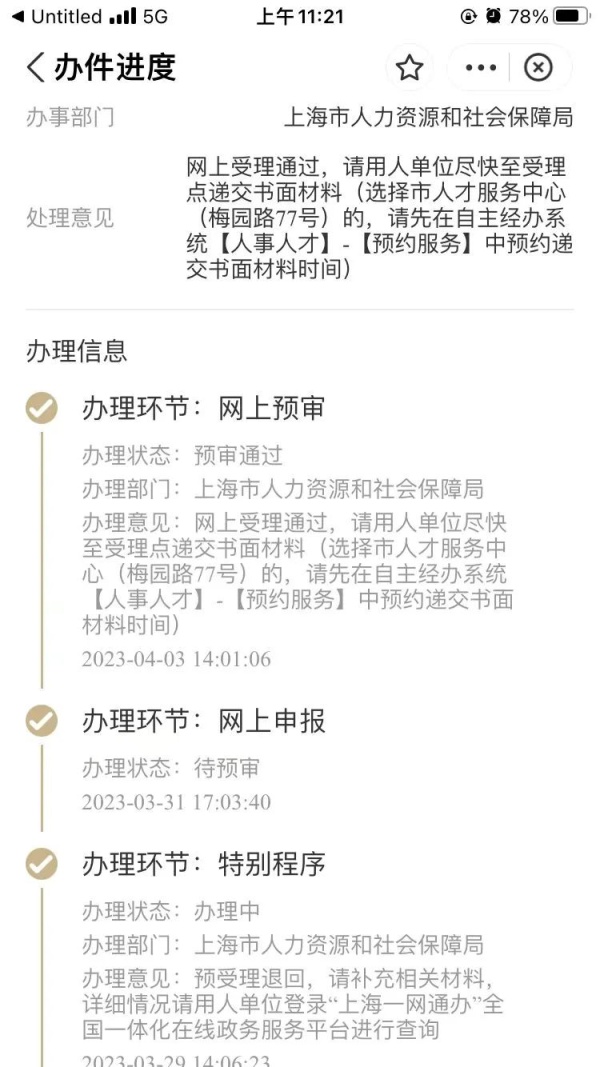 Tips:“随申办”查询,能显示完整的审批流程和当前节点状态(通过/退回),但是如果材料被退回的话,是无法看到退回原因和需要补充的相关材料的。