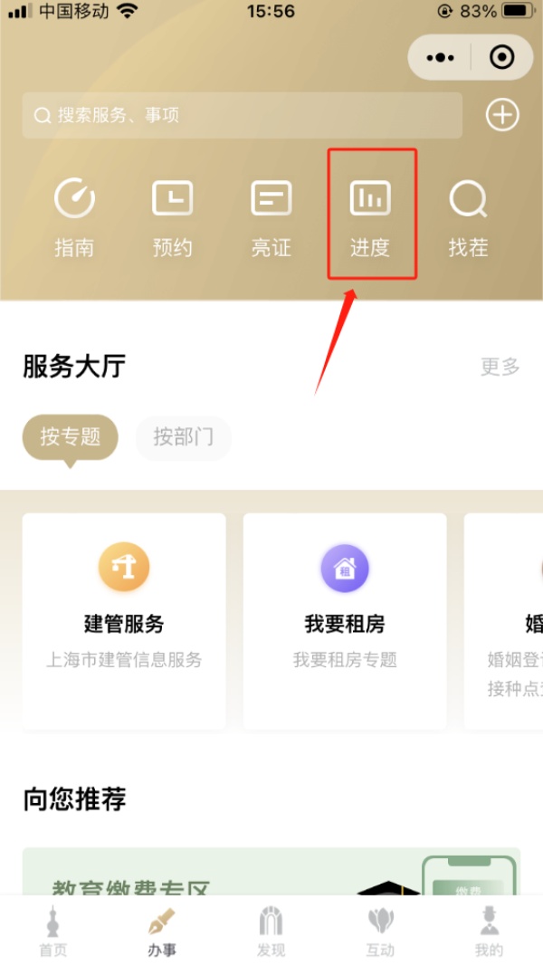 2.在“办事”版块中选择“进度”;