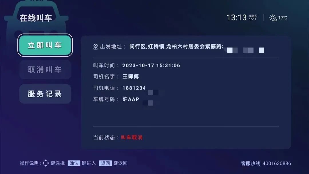 当电视上显示出巡游出租车叫车成功的提示后,司机王师傅的联系方式和出租车的车牌号也会同步显示,在余伯伯接到王师傅的来电后就可以顺利出行。余伯伯对此称赞不已:“这个可以!很方便,不需要输入地址,只需按一个键就可以在家叫车”。
