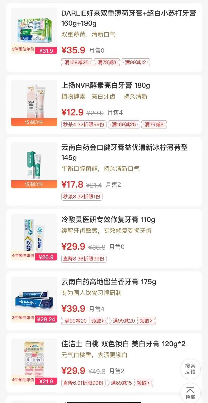 佳洁士、好来、高露洁等品牌牙膏多在20元左右;