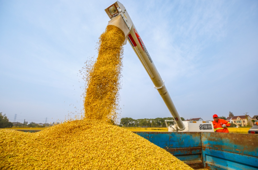 你瞧,周浦镇北庄村的田间地头正是一片繁忙的景象。期待了一年的农人们,在青绿相间的稻田里收割成熟的稻谷。