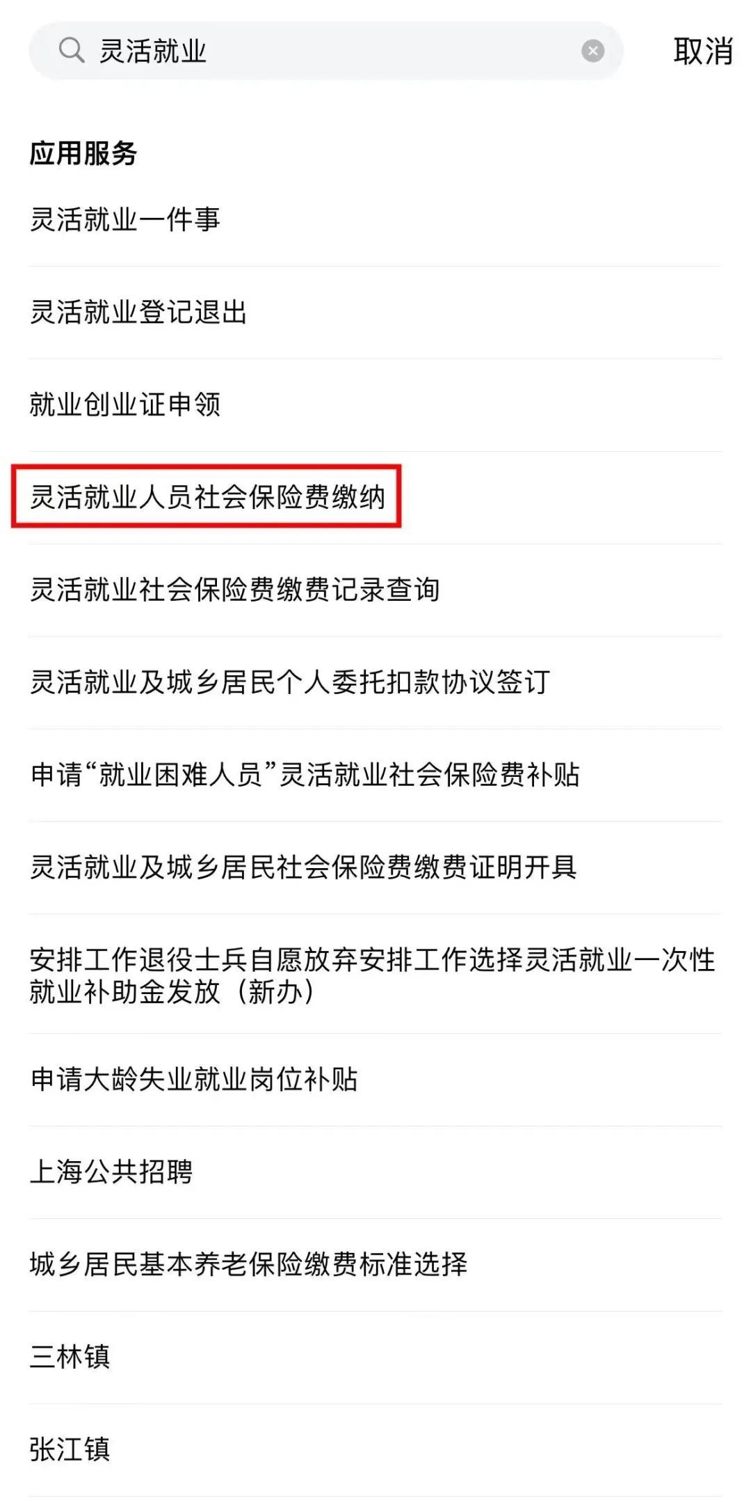点击“上海税务”微信公众号——便民办税——社保费缴纳,进入“随申办”微信小程序,在搜索框中输入“灵活就业”,在结果列表里找到“灵活就业人员社会保险费缴纳”服务,点击进入办理界面,即可在线办理(登录“随申办”APP、“随申办”支付宝小程序也可完成相关缴费流程)。