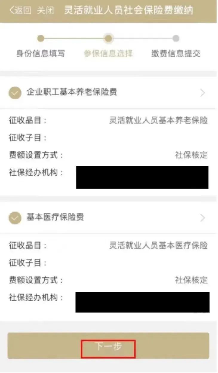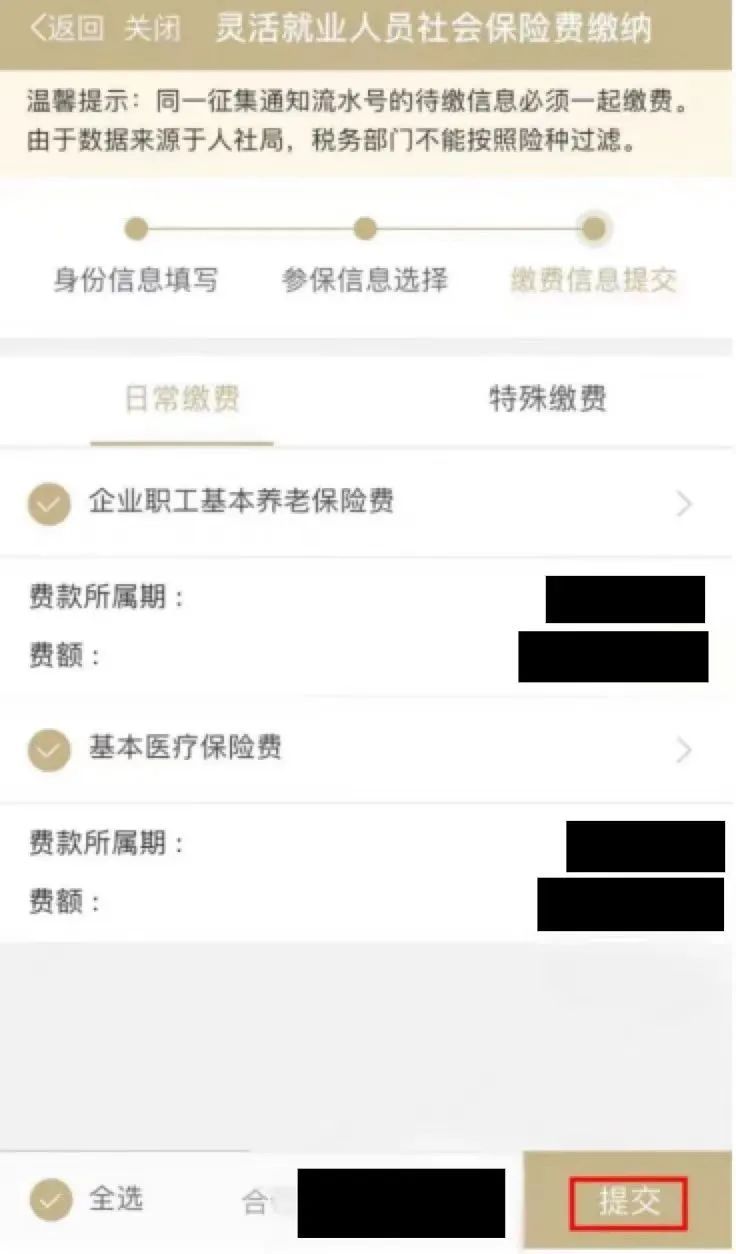 系统自动跳出缴费人参保险种信息,核实无误后点击“下一步”,系统默认选择“日常缴费”,如需办理“特殊缴费”请自行勾选,此步核实缴费信息无误后,点击“提交”完成缴费即可。
