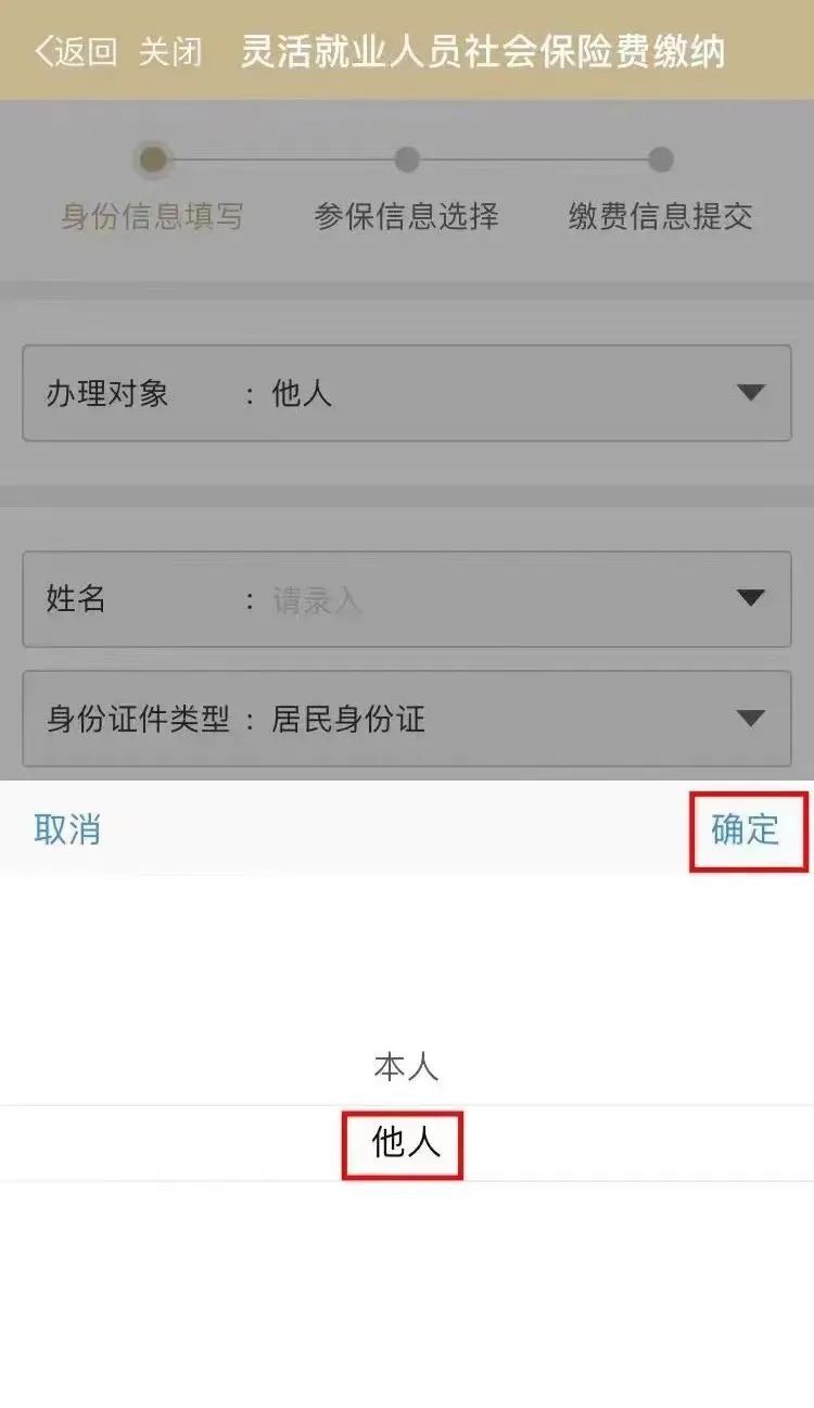 该服务可选择为本人或他人在线缴纳,若为本人缴费的,直接点击“下一步”;若为他人缴费,需主动将“办理对象”修改为“他人”,并填写姓名与证件号码。