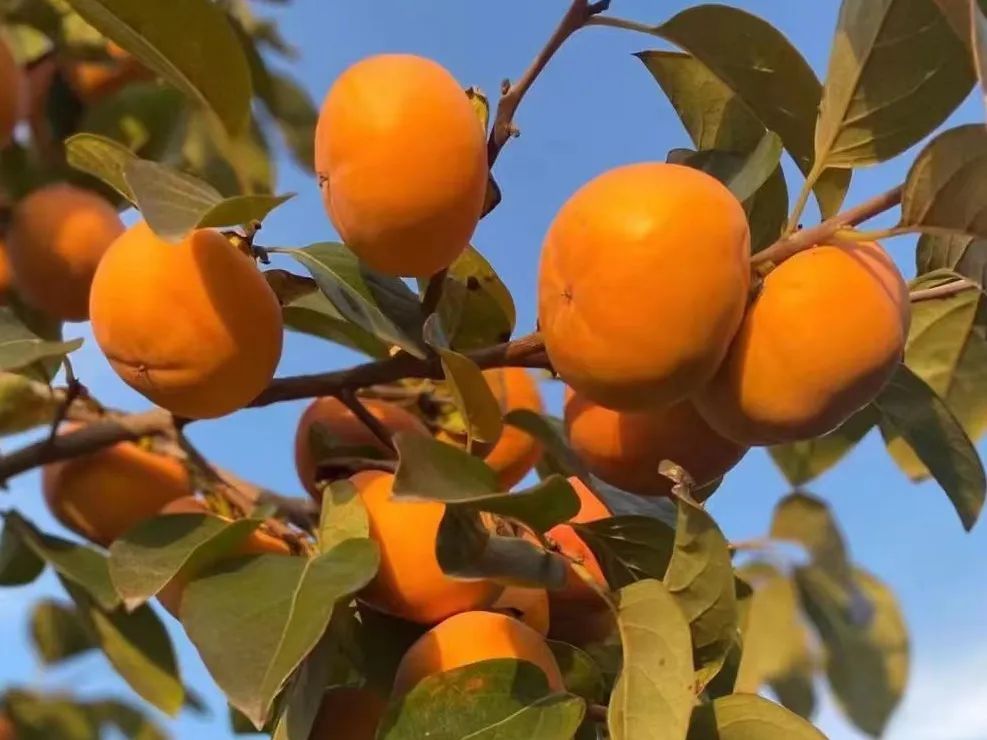 一只只红彤彤的柿子宛如高高挂起的红灯笼,在阳光的照射下愈发饱满盈实、娇艳欲滴。