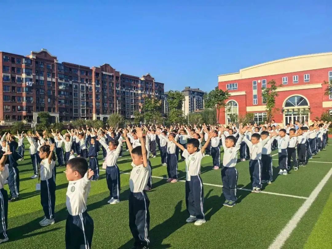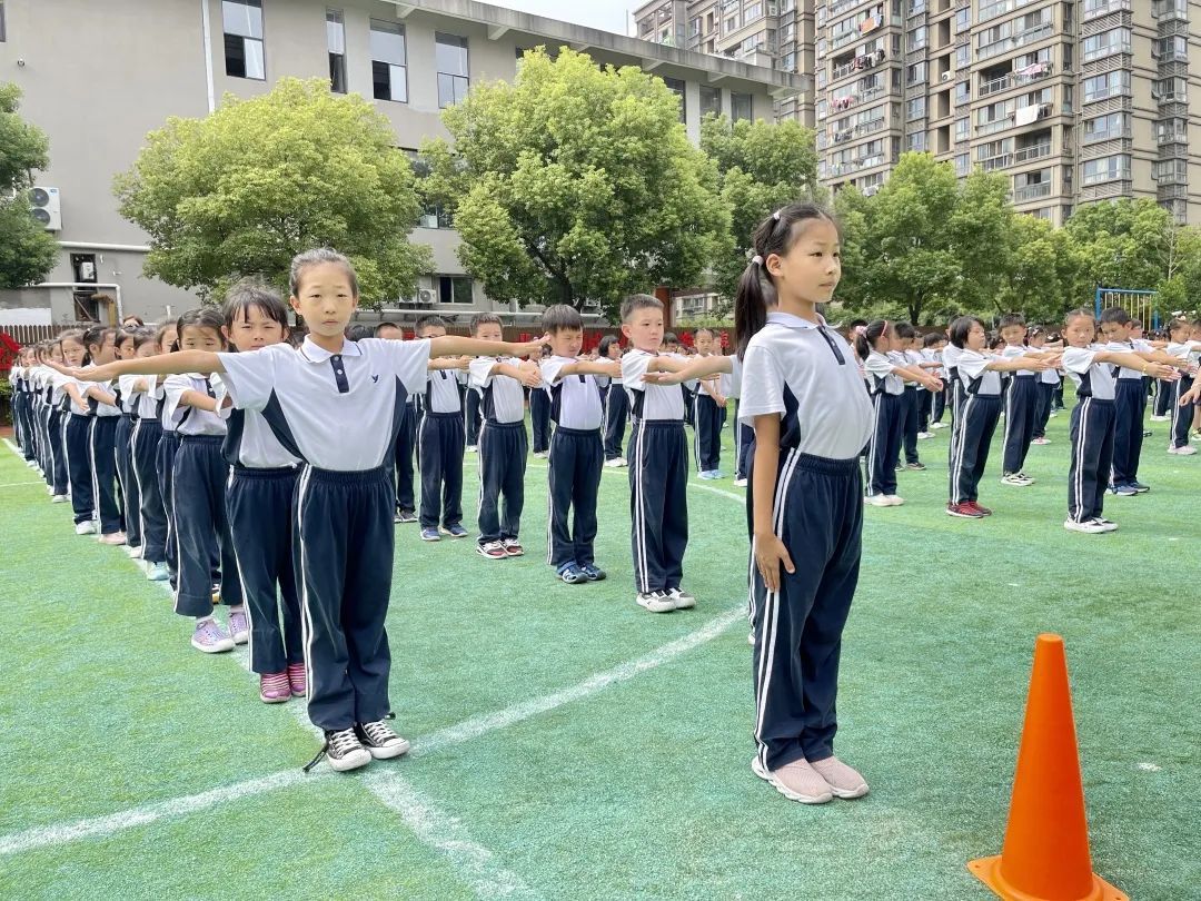 每天坚持锻炼让一年级的萌娃们拥有一个棒棒的身体,抬头挺胸,姿势标准,广播操动作整齐划一。