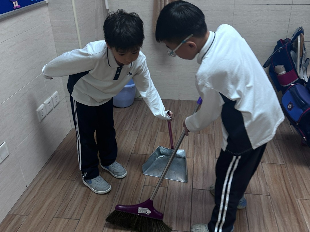 教室整洁靠大家,看,大家正在认真地打扫呢。拿着扫把、抹布有模有样,个个都是劳动小能手!
