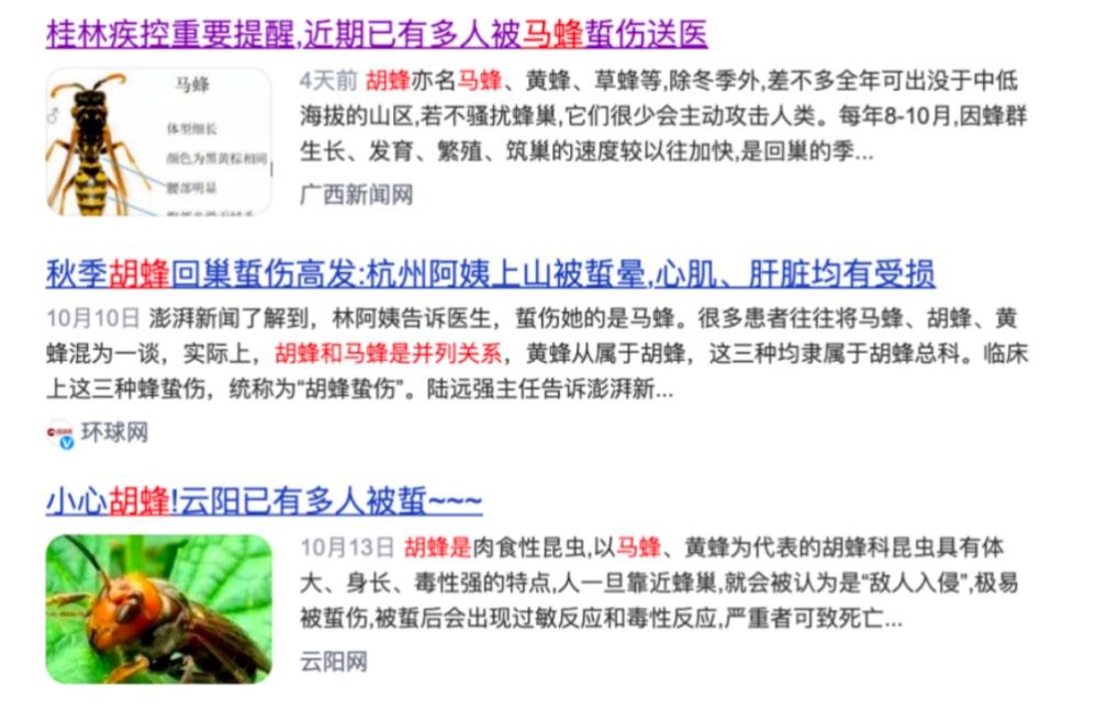 当下秋高气爽,正是进行登山、郊游等户外活动的好时节。不过,在感受大自然魅力的同时,可能身边也潜伏着巨大的危险。最近,多地发生了马蜂蜇人的事情,甚至造成了多人死亡。 多地发生马蜂蜇人致死 日前,河南洛阳一名46岁的男子到自家平房上干活,不料被一群马蜂攻击,短短几分钟,男子就出现了呼吸困难、嘴唇发紫等症状。遗憾的是,医生在重症监护室抢救了一周,未能挽回其生命。 10月20日,四川泸州38岁的民间航拍摄影者宋某某在古蔺县白泥镇山区航拍时,因寻找无人机被野蜂蜇伤,经抢救无效身亡。 9月20日,安徽省黄山市黄山区汤口镇山岔村68岁的村民郑某燕在家门口被马蜂蜇伤,人三四分钟就不行了,两眼发直,说不出话来。送往镇医院途中,人已经口吐白沫。到了医院,5名医生轮流做心肺复苏,肾上腺素也打了两支,抢救了差不多50分钟,最终还是去世了。 被胡蜂蜇一下很可能要命! 被马蜂蜇了,这么要命吗?胡蜂,也名马蜂、黄蜂、草蜂等。世界上已知胡蜂种类有5000多种,我国记载的有200余种。 提起蜂蜇伤,我们常常会想到蜜蜂,蜜蜂总科下有很多种蜂类,多有毒刺,一般蜜蜂只能蜇一次,而胡蜂科是除蜜蜂类及蚂蚁类之外的最能蜇刺人的昆虫之一,体大身长,毒性也大,胡蜂具有极强的攻击性,由于毒刺结构特别,刺入受害者皮肤释放毒素后可轻易拔出,可以蜇多次。 北京大学第一医院急诊科医生刘斯表示,被胡蜂蜇后,局部伤口可出现疼痛、红肿、丘疹及红斑,或中心坏死性病灶,严重时引起全身炎症反应综合征,可伴循环系统、神经系统、泌尿系统等全身多系统损害,严重中毒者可死亡。 胡蜂蜇伤发病高峰出现在8~10月,7月和11月也较多。河南科技大学园艺与植物保护学院副教授陈应武介绍,这个时节,新产生的蜂王会与老蜂王分家,带领部分马蜂到别处筑巢产卵,随着天气转凉,一般选择靠近人居住的地方安家,加上树叶凋零,蜂巢容易暴露,蜂群的警惕性增高,且性情暴躁,蜇伤人的情况会比夏天多。 外出如何避免被蜂蜇? 刘斯医生介绍,通常蜜蜂不会随意攻击人类,遇见蜜蜂,不要用手挥舞驱赶,远离它即可。相反,如果极力抵抗,蜜蜂会误认为遭到攻击,甚至发出讯息招来群蜂进行集体攻击。 若是不小心在山上、野外碰上了胡蜂蜂巢,立即远离,以免惊动、侵扰整个蜂群。 被蜇了如何正确处理? 北京市密云区医院急诊外科医生高巍提醒,户外活动或游玩时,如果遇到蜂蜇伤后: 第一,如果毒针留在了皮肤上,立即用针头或者注射器挑出毒刺,或用卡片刮出毒刺。切勿用镊子夹出毒刺,因为当你用镊子或钳子夹住毒刺的那一刻时,有可能会把毒刺内的残留毒液再次注入人体内,加重过敏反应。 第二,蜜蜂蜇伤,因其毒液为酸性,可用肥皂水涂敷蜇伤局部。黄蜂蜂毒与蜜蜂蜂毒不一样,为弱碱性,所以局部可用食醋擦洗伤处。如果在户外,我们也可以用凉水冲洗蜇伤处,对局部的疼痛也会有一定的缓解。 第三,局部红肿发痒可外用药膏观察。 第四,若全身出现皮疹、恶心呕吐、嗓子发紧、心慌憋气、大小便失禁等不适症状时,一定要切记立刻就近就医。