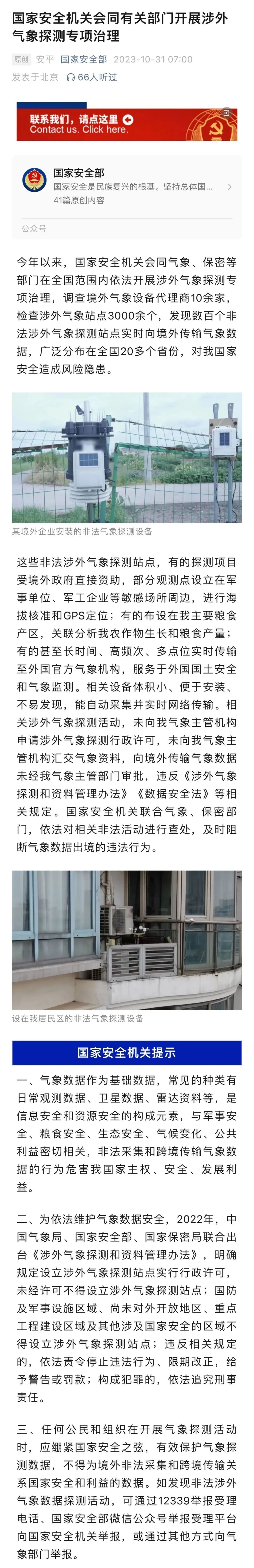 10月31日,国家安全部发文《国家安全机关会同有关部门开展涉外气象探测专项治理》,文中提到,今年以来,国家安全机关会同气象、保密等部门在全国范围内依法开展涉外气象探测专项治理,调查境外气象设备代理商10余家,检查涉外气象站点3000余个,发现数百个非法涉外气象探测站点实时向境外传输气象数据,广泛分布在全国20多个省份,对我国家安全造成风险隐患。内容如下: