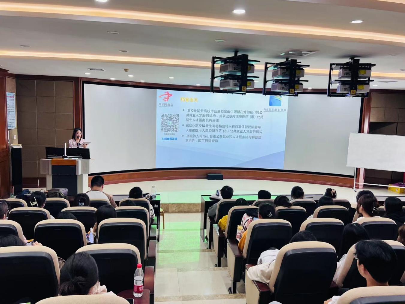 宣讲会现场,宣讲员向学生们详细介绍了青岛生态宜居、开放包容、产业兴旺的发展势头,以及实习补贴、青年人才一次性安家补贴、高校毕业生住房补贴、博士后培养资助等“人才强青”计划中一系列惠才政策。同时,对企业文化和岗位需求进行细致讲解。