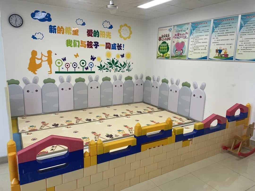 为了满足居民们的需求,让社区0-3岁的学龄前儿童拥有一个室内游玩和学习互动的空间,泗泾镇韵意四村居民区重新改造社区内的“小太阳”早教乐园。换掉已发霉脏污的老旧垫子,重新置办儿童桌椅、幼儿玩具等设施设备,并在墙面上张贴兔子、萝卜等充满童趣的防撞贴,功能升级的同时更让安全加倍。