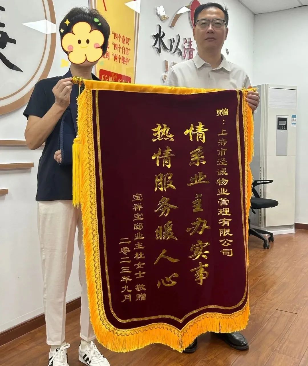 一面锦旗,十分肯定!近日,家住宝山区罗泾镇金色宝邸的杜阿姨特地给泾诚物业送来了一面印有“情系业主办实事、热情服务暖人心”的锦旗,赞扬泾诚物业和社区工作人员尽职尽责、服务为民的精神。