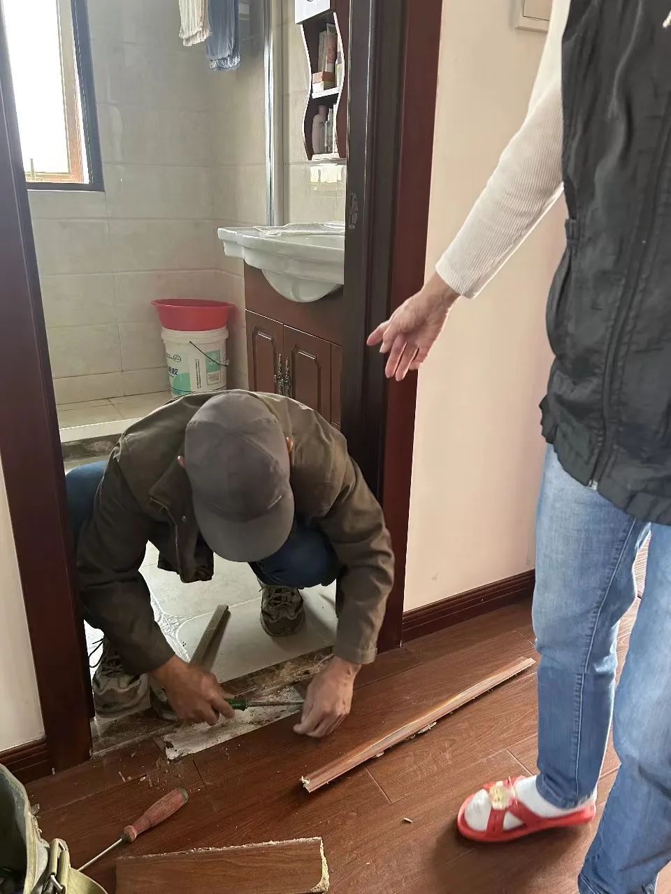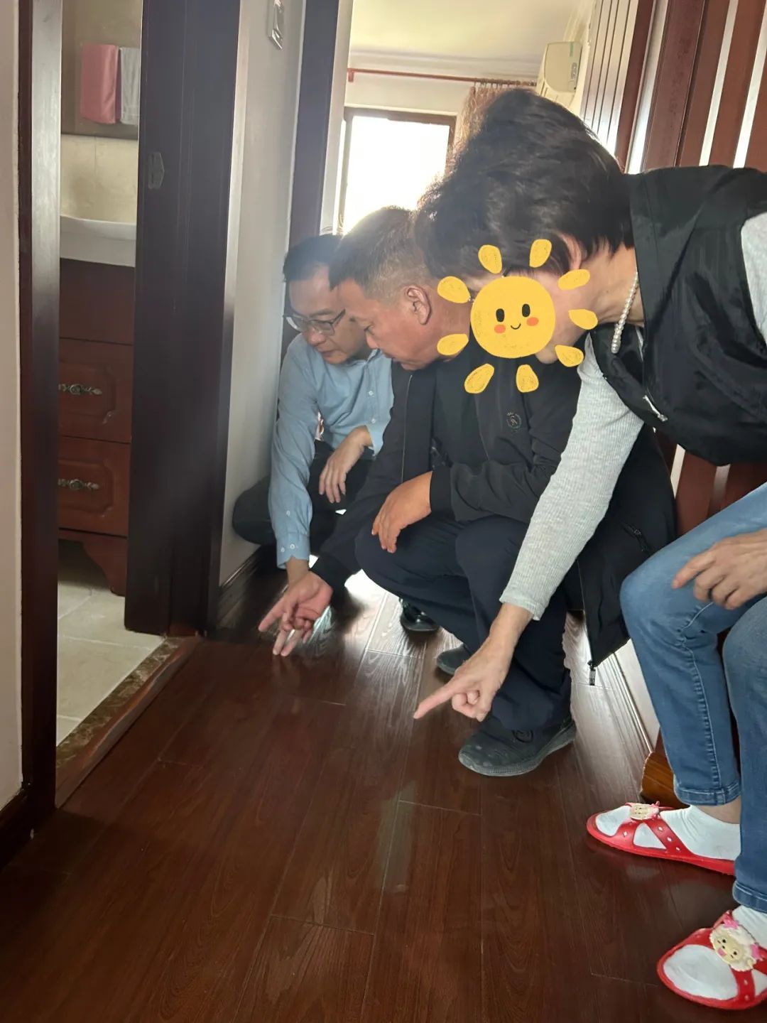 今年以来杜阿姨家中卫生间开始出现渗水现象,导致客厅地板严重变形。老人曾请来防水公司堵漏,但是,不仅没有修好,渗漏情况还越来越严重。在一次闲聊中了解到杜阿姨有这个困扰后,泾诚物业马上上门实地勘查,并组织专业人员进行维修,渗水问题不仅得到了彻底解决,困扰老人多时的烦恼也随之一扫而空。